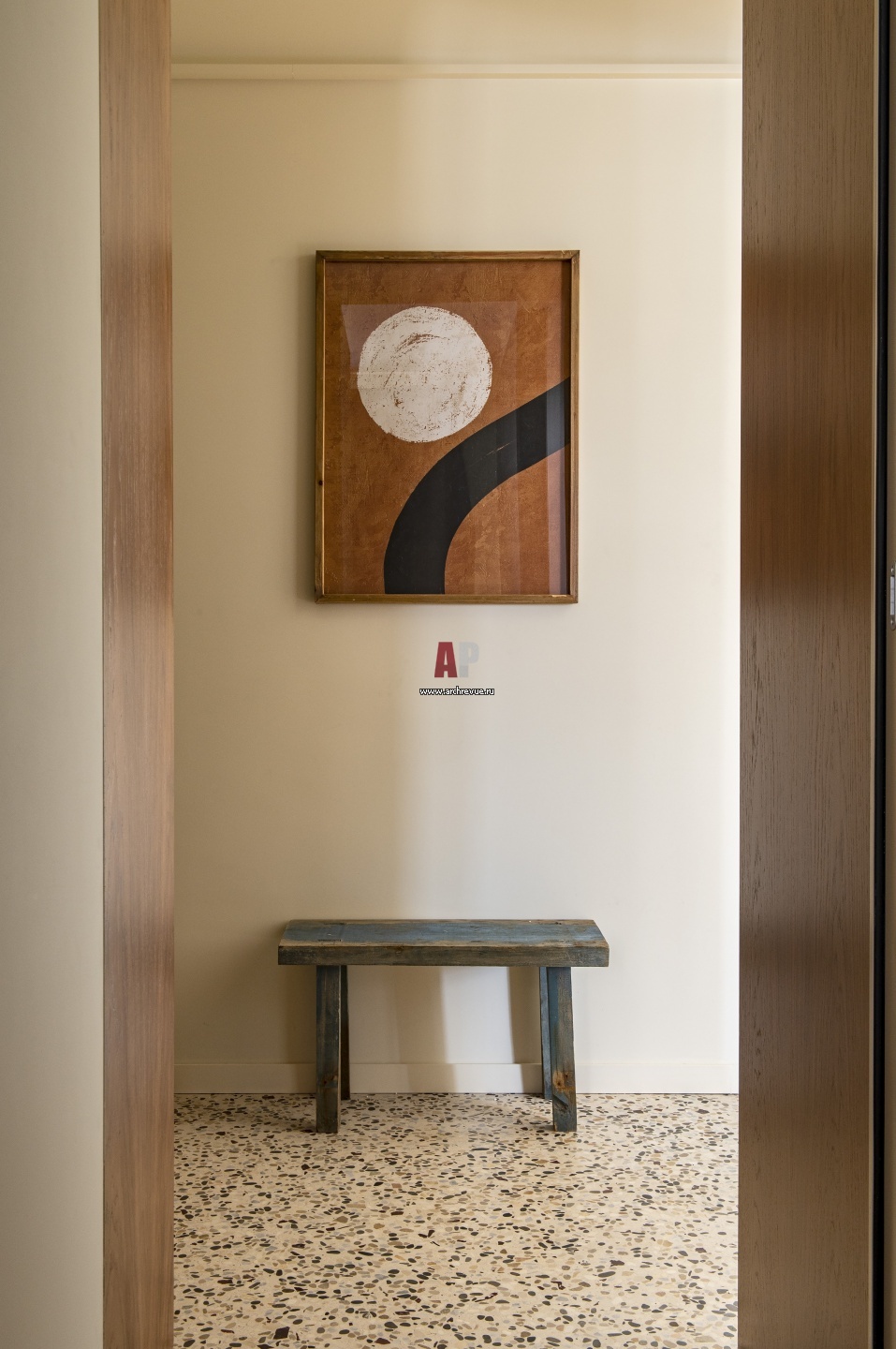 Плитка терраццио на полу в прихожей – дань сталинской архитектуре дома, актуальный тренд и просто очень удобное и красивое покрытие.