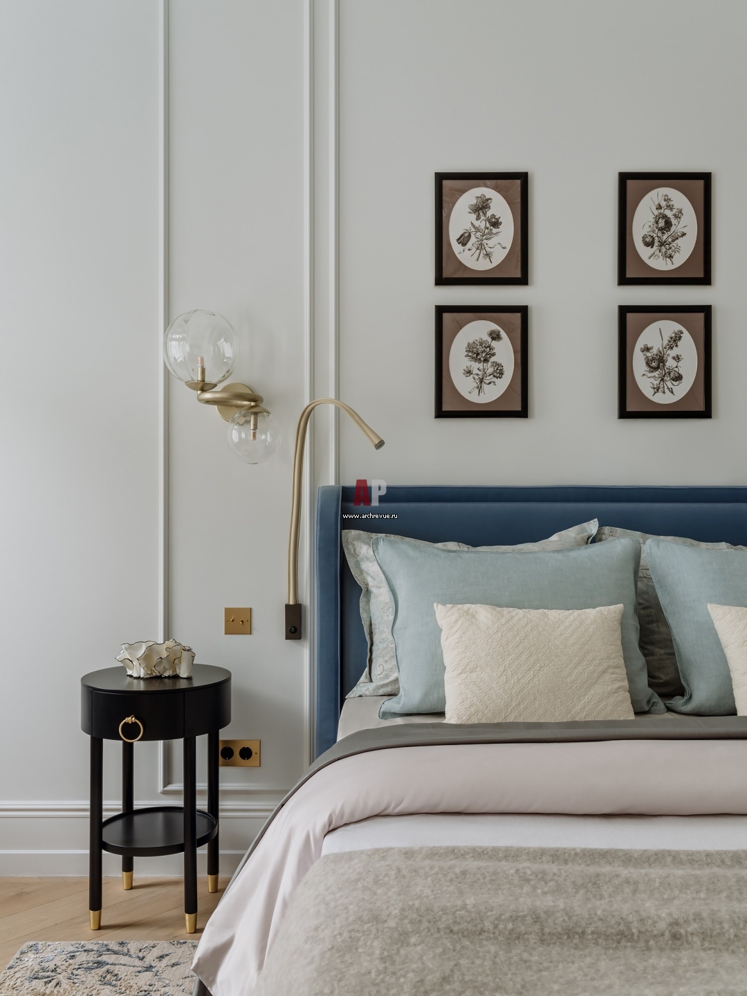 Спальня дочери. Фоновый цвет квартиры белый. Акцентные цвета повторяют палитру драгоценных камней: аквамарина, хризолита, турмалина, граната. Кровать в детской – в цвете голубого топаза.