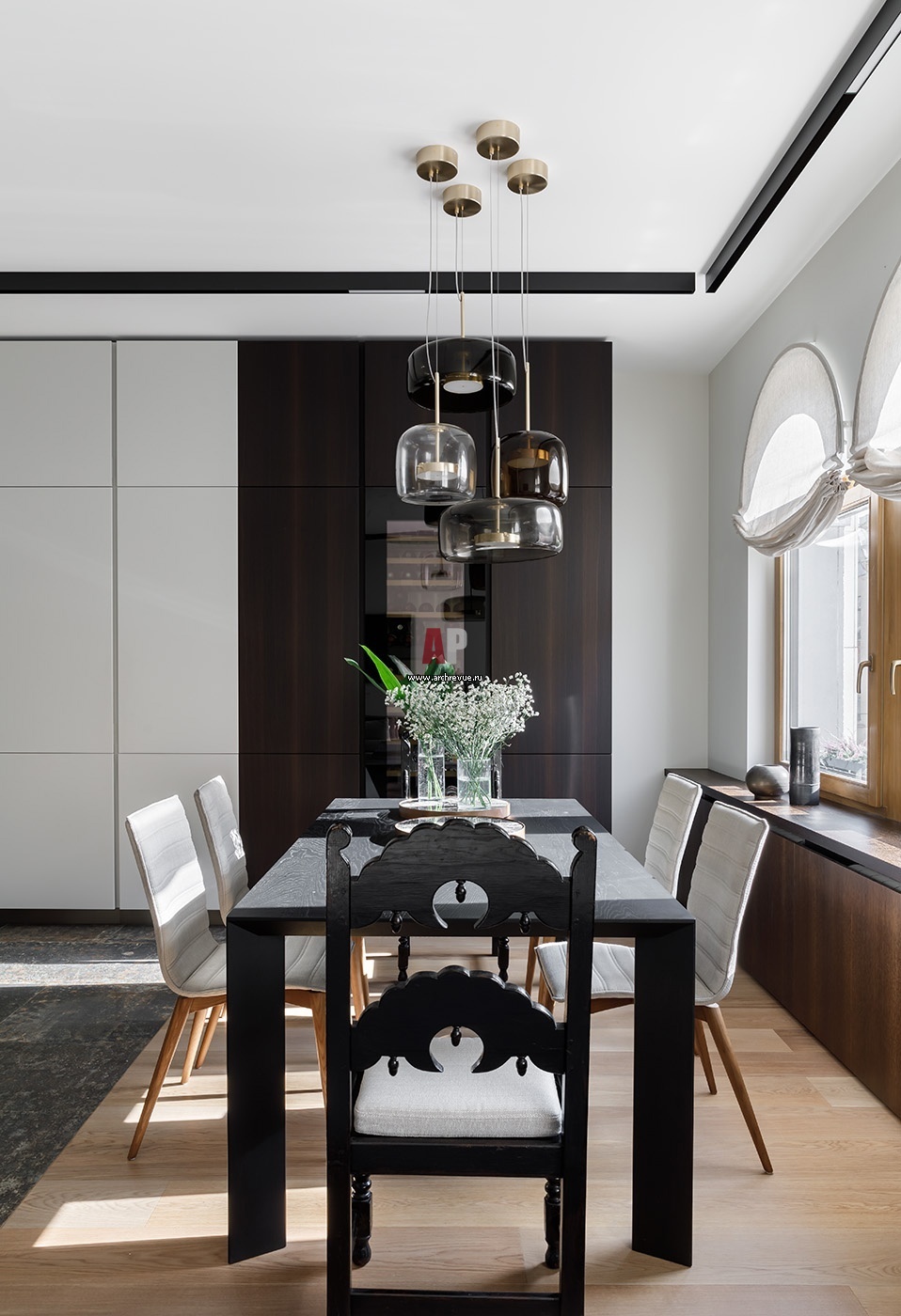 В дизайне квартиры тонко переплетаются современность и традиции. Черные резные стулья, антиквариат.