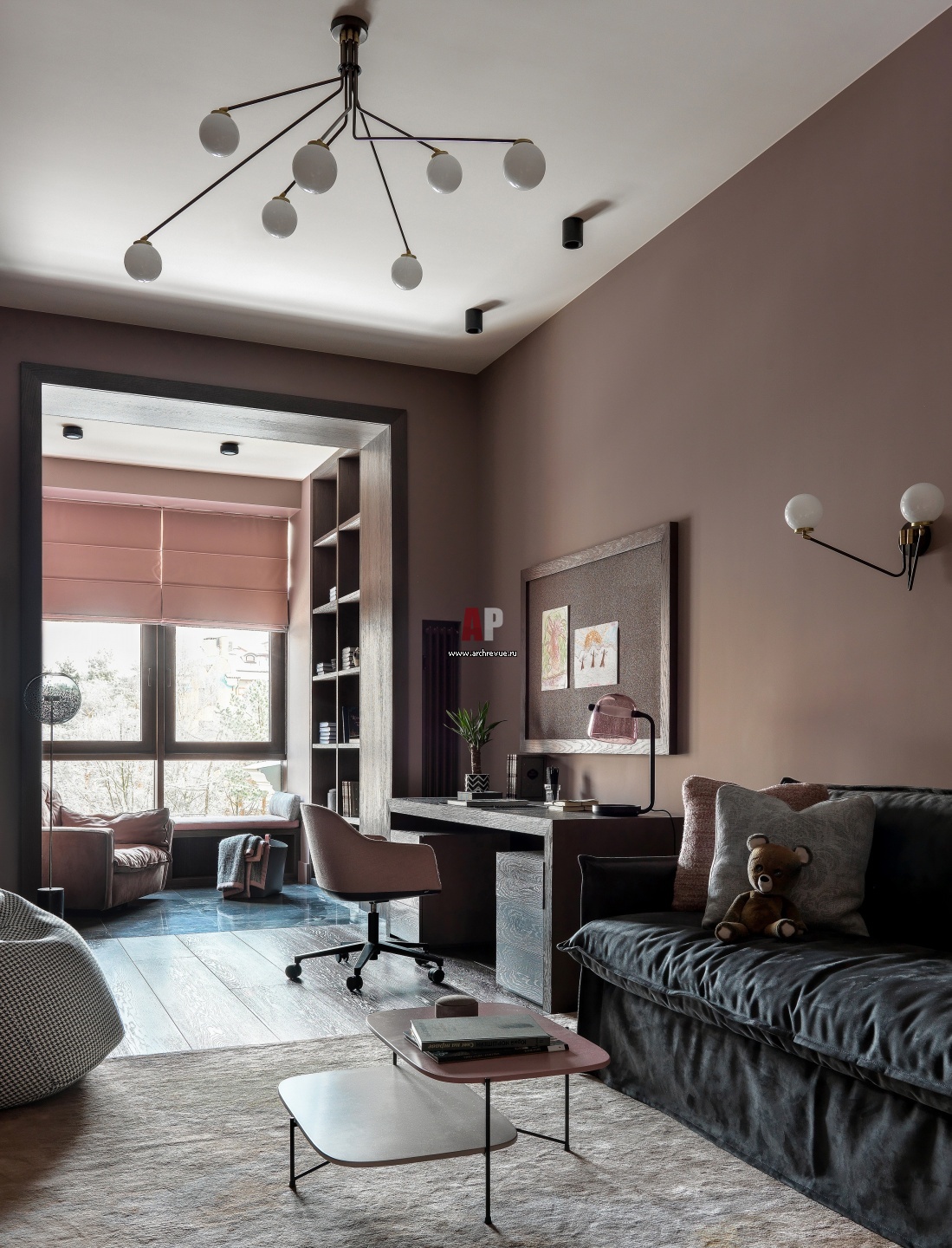 Детская спальня с припыленными розовыми оттенками выполнена в общей стилистике квартиры. Раскладной диван, Milano Bedding. Столик, Saba Italia. Кресло, Baxter. Центральный светильник и бра, CTO Lighting.