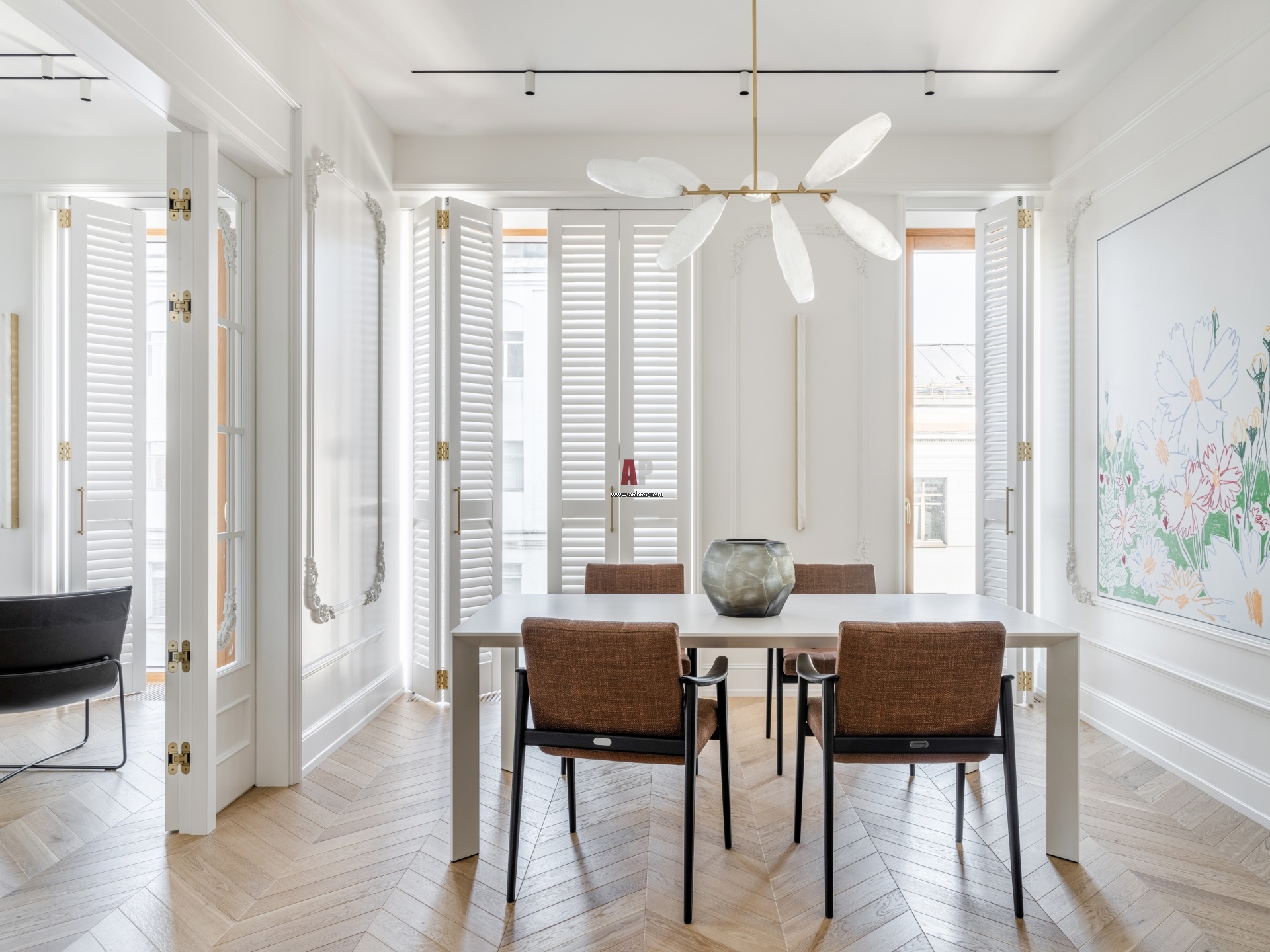 Столовая. Обеденный стол, Desalto. Стулья, Minotti. Ассиметричная люстра, Giopato & Coombes.