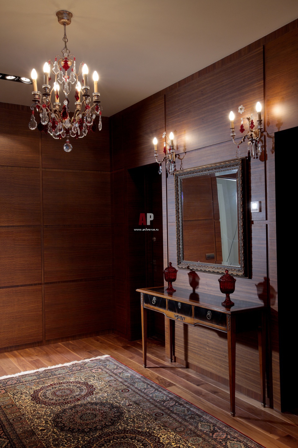 Входная зона зашита деревянными панелями из ореха. За ними скрываются гардеробные и технические помещения. Работы по дереву, TermitStudio.