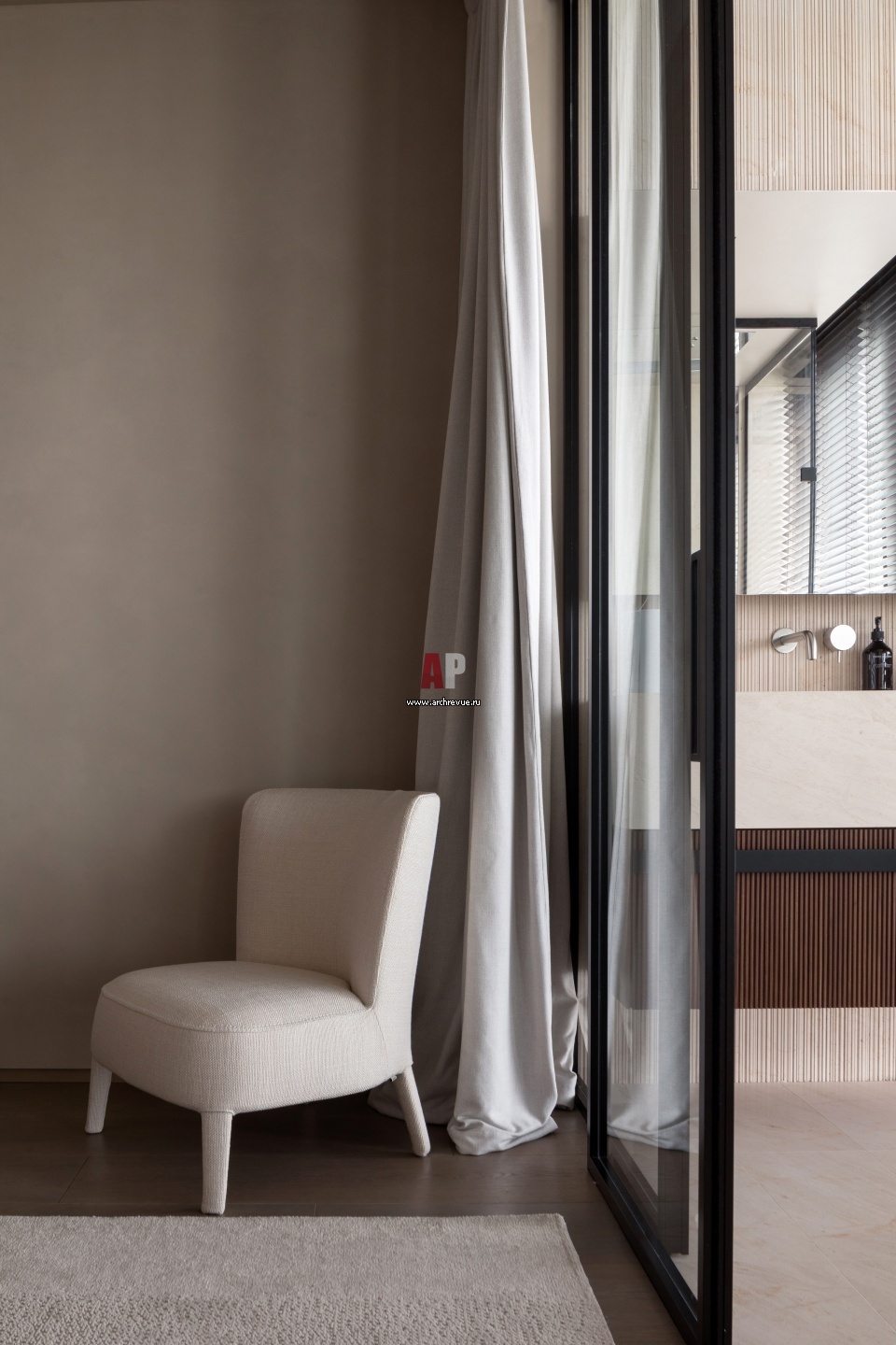 Выход из спальни в ванную комнату на лоджии. Кресло Maxalto, модель Febo. Ковер, Molteni&C, модель Random. Стеклянные перегородки Rimadesio, коллекция Velaria. На стенах – известковая краска.