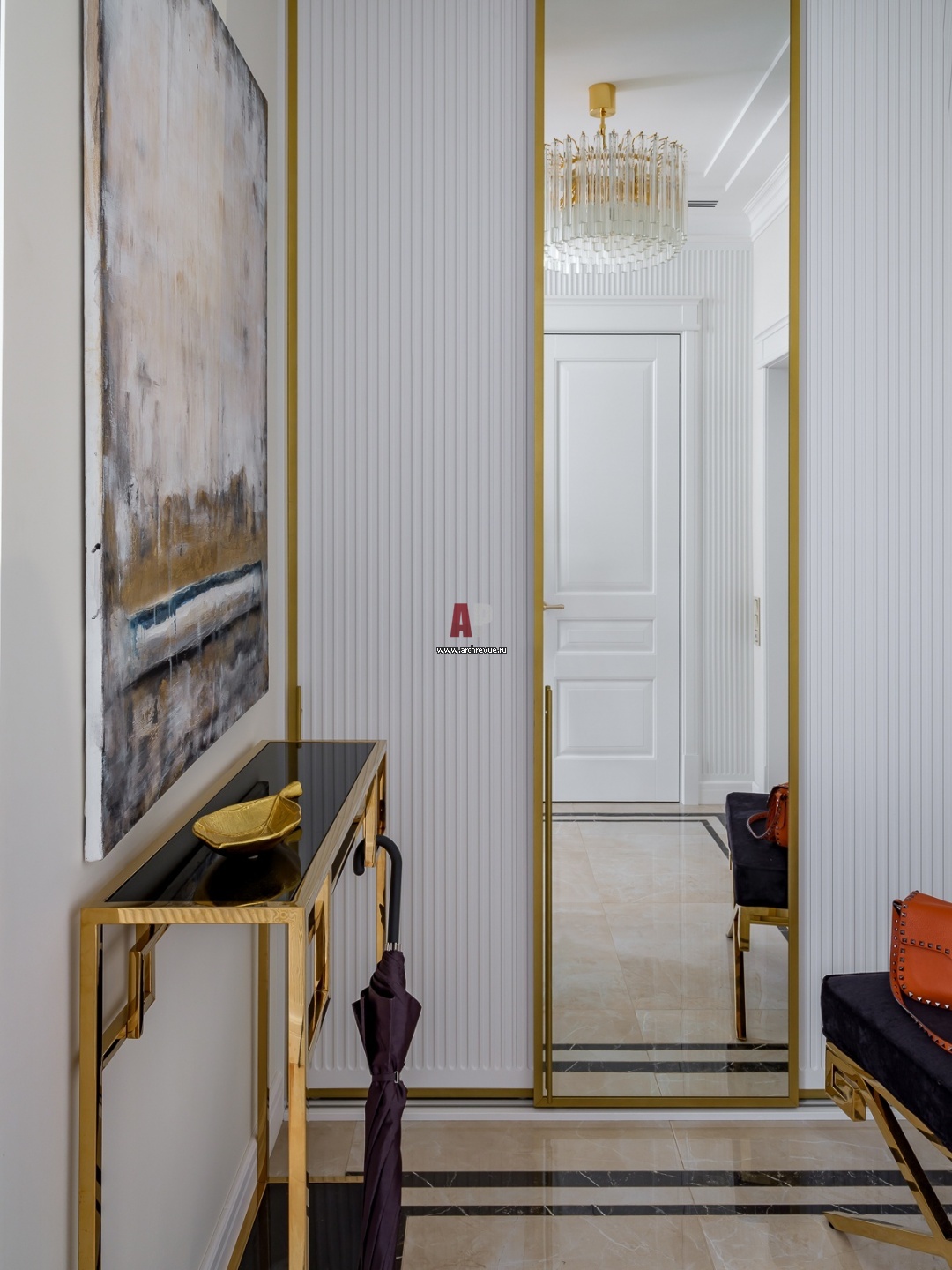 Прихожая сделана белоснежной. Строенный шкаф украшен зеркальными вставками. Консоль из латуни, Eichholtz.