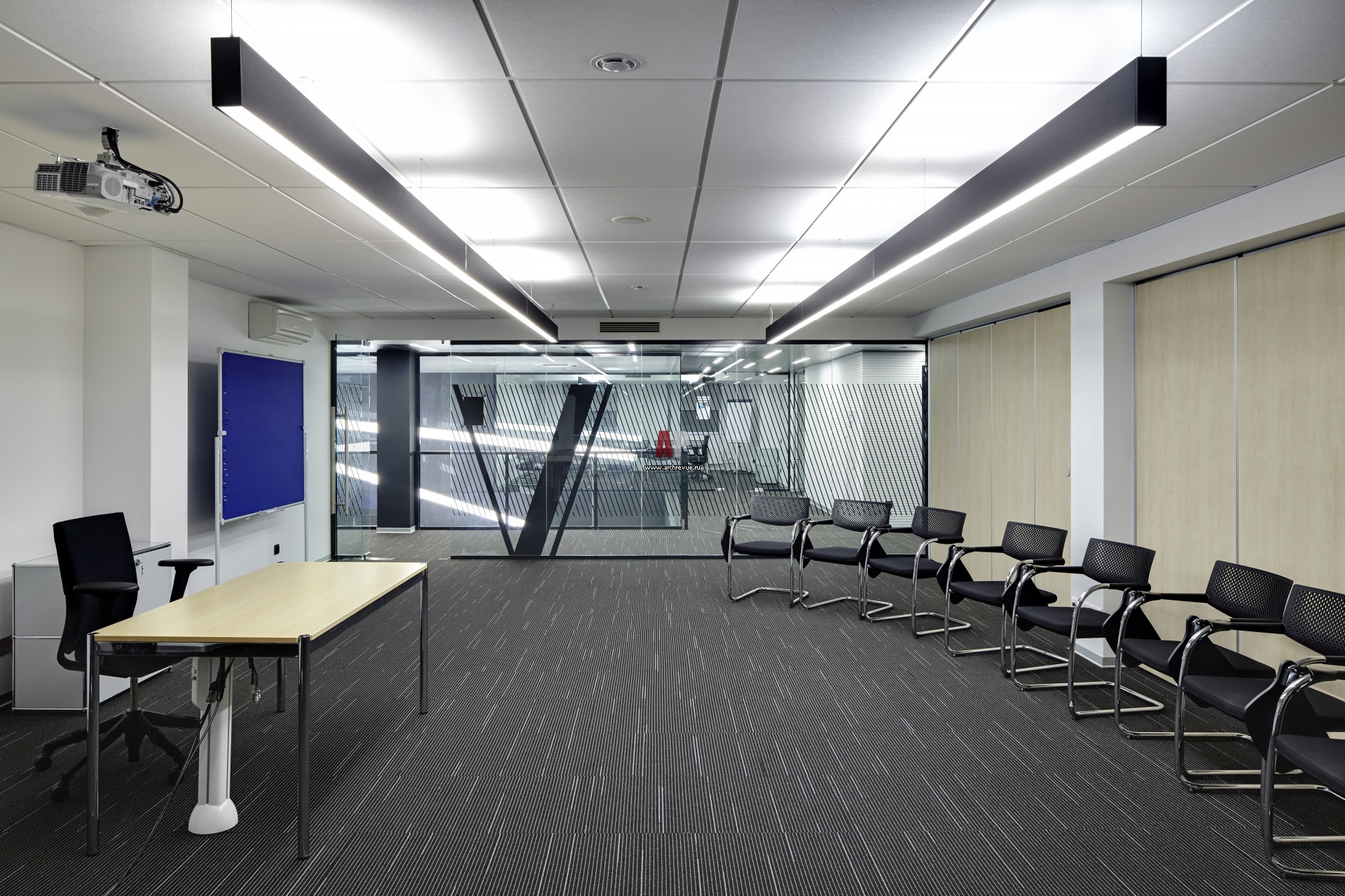 Переговорные комнаты и обучающие помещения находятся на втором этаже. Он холла они отделены перегородками из прозрачного стекла с черным принтом-монограммой.