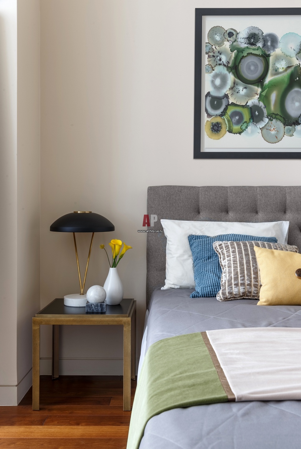 Интерьер спальни в стиле фьюжн. Лампа Visual Comfort & Co, по дизайну Aerin Lauder. Картина, Crate and Barrel.