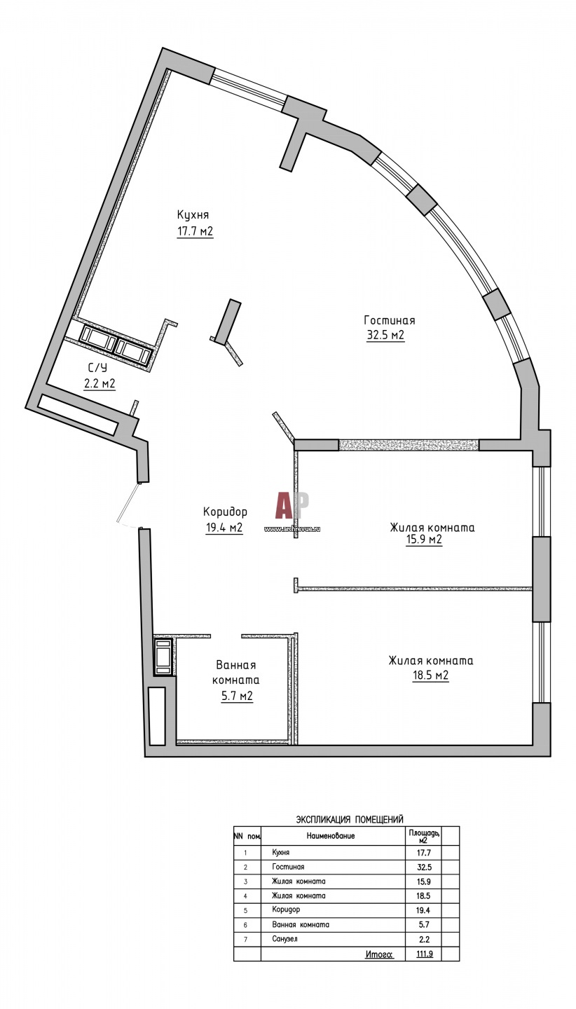 Исходная планировка 3-х комнатной квартиры сложной геометрии в новом монолитном доме. Общая площадь – 105 кв. м.