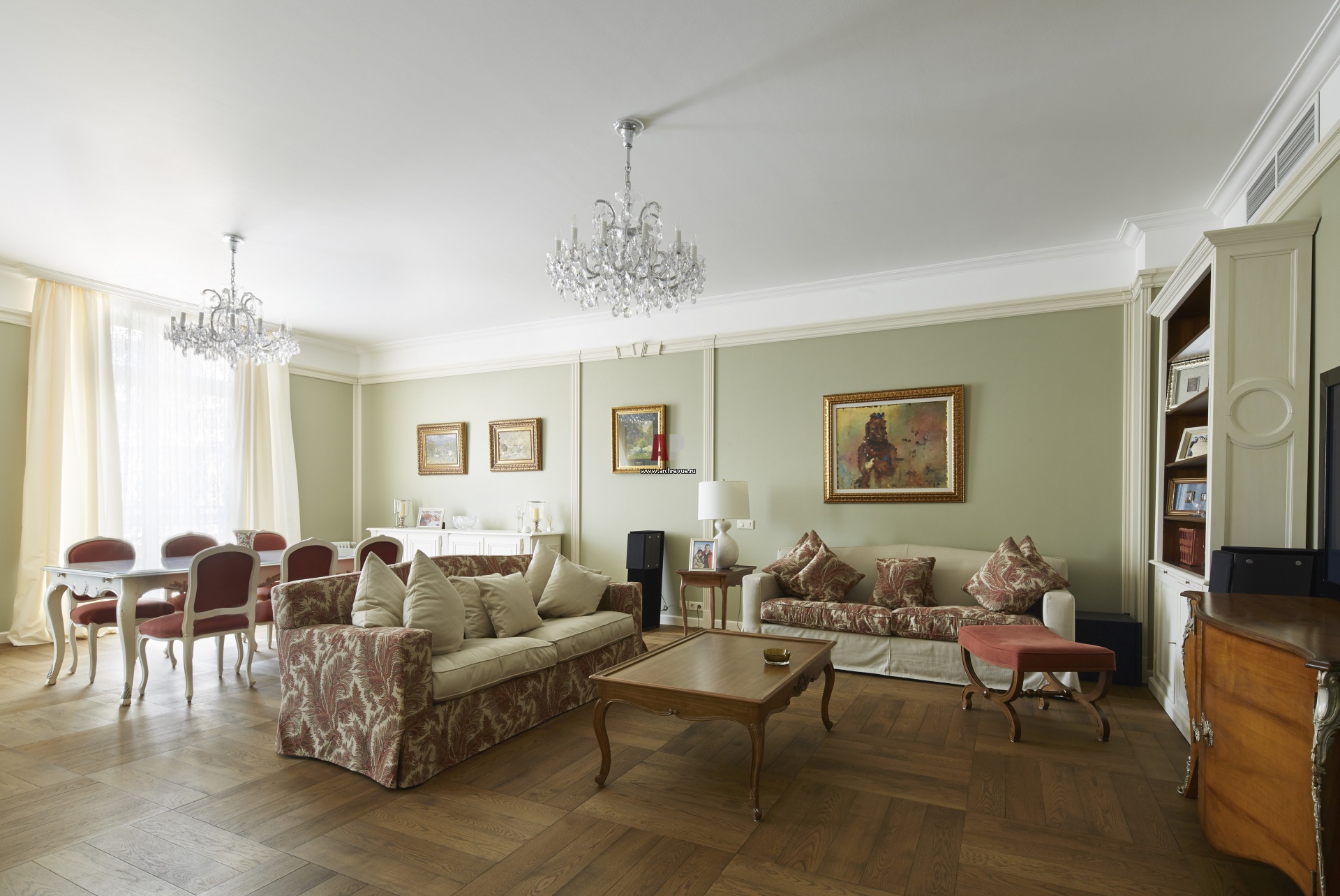 Интерьер гостиной в духе легкой классики. Стены выкрашены однотонной матовой краской пастельного фисташкового цвета. Пилястры, карнизы – лепной декор Orac Decor, поставщик «Ампир Декор». Хрустальные люстры, Preciosa Lighting.