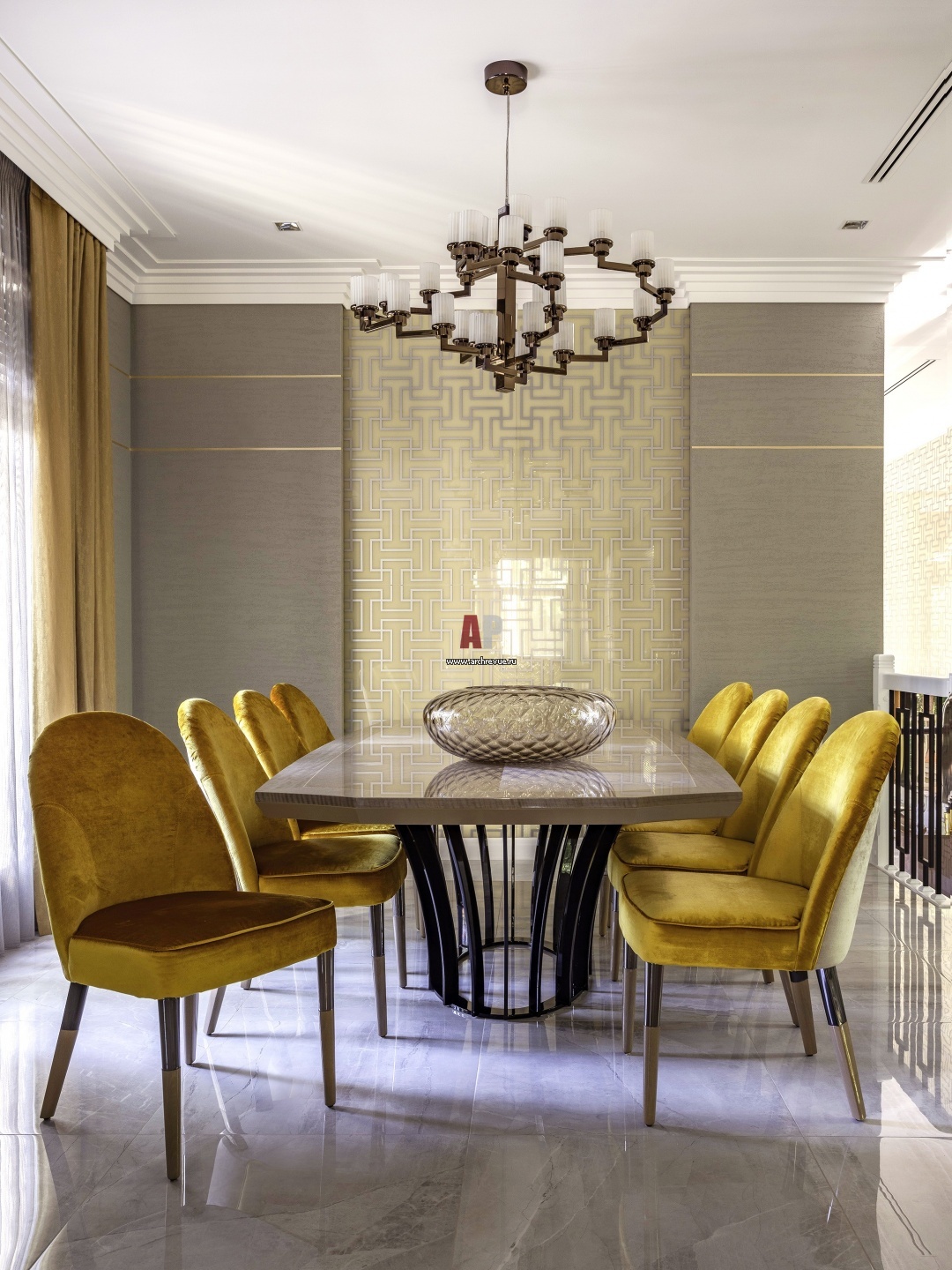 Парадная столовая группа. На стенах – декоративная штукатурка Travertino Romano, Oikos, на основе мрамора и кварца. Плоскости стен дизайнер усложнила с помощью тонких позолоченных вставок в стиле ар-деко. Обеденный стол, стулья, Giorgio Collection, коллекция Alchemy