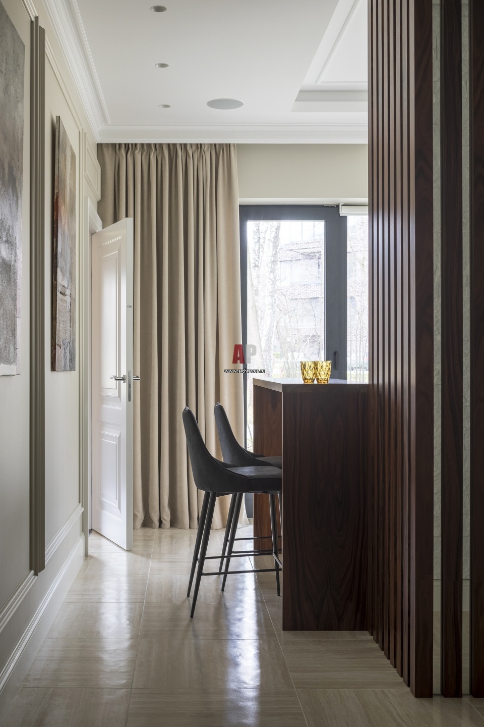 Развернув кухню к окну и разместив барную стойку для завтраков к телевизору, архитекторы получили небольшой коридор между кухней и гостевой ванной комнатой. Чтобы визуально расширить пространство и избежать «тунельности», они использовали зеркальное панно с чередованием шпонированных реек.