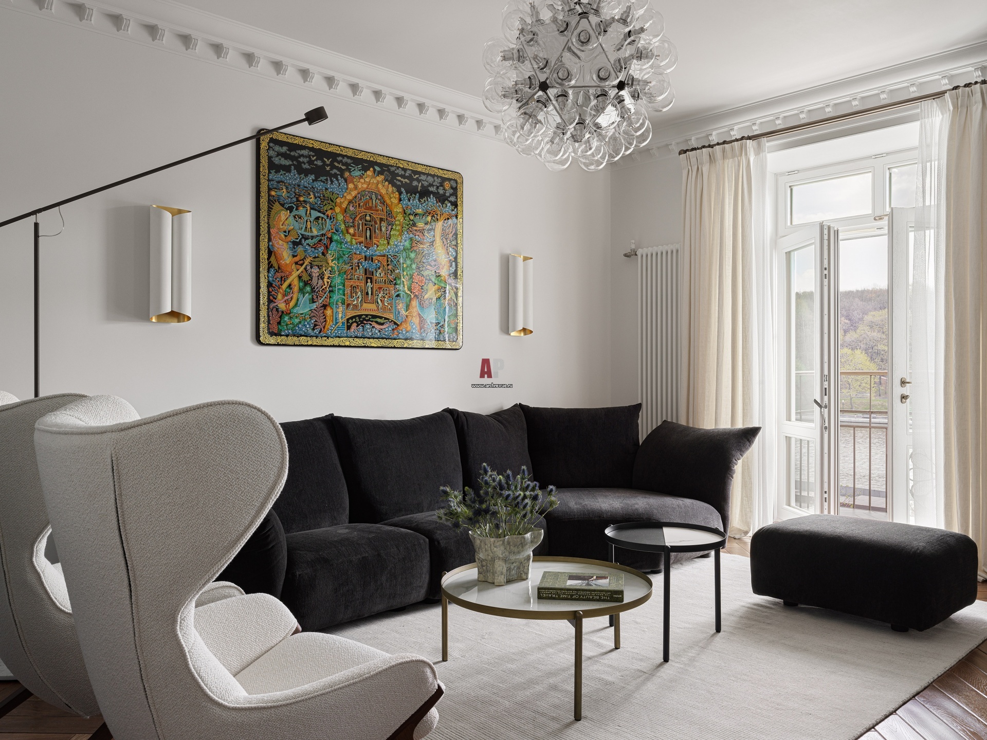 Светлая гостиная. Белые оконные рамы с латунными ручками изготовлены на заказ. Карниз повторяет внешние карнизы сталинских домов. Потолочные розетки выбрали минималистичные, так как люстра достаточно декорированная.