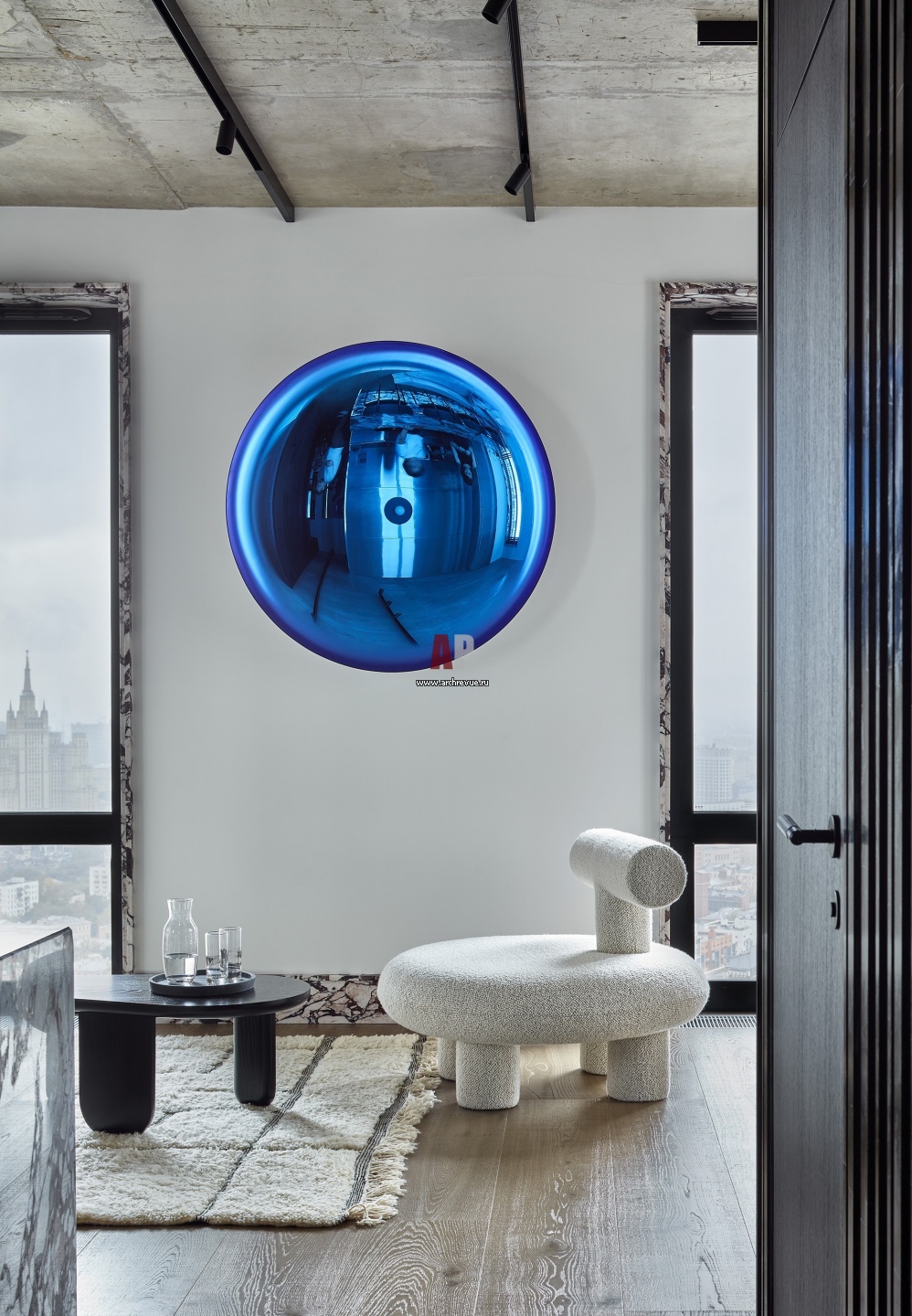 Обилие окон в пол и единственная несущая стена позволили сделать гостиную, столовую и кухню одним пространством. Кресло, Olga Engel Design в ткани Pierre Frey.