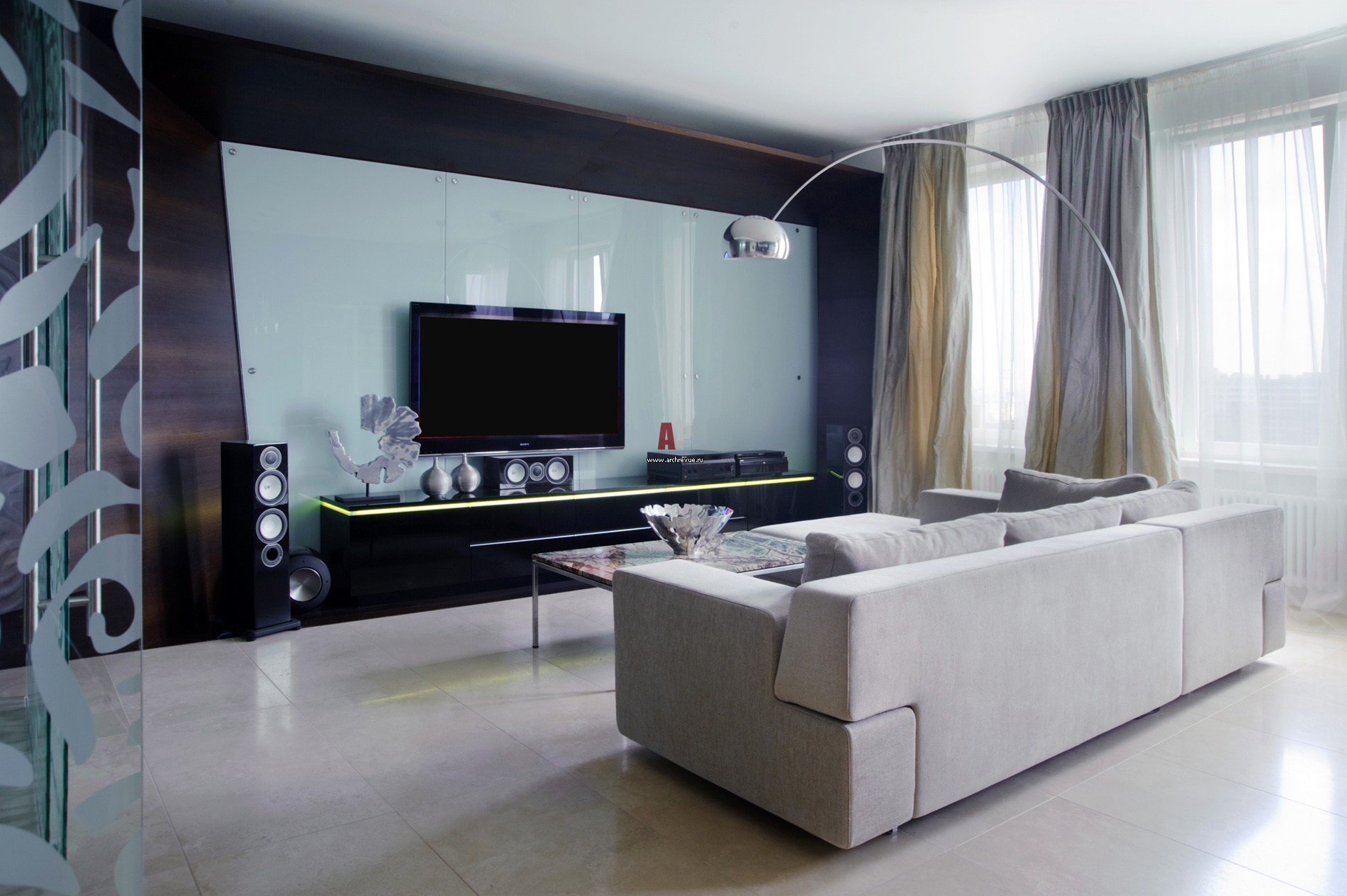 Яркая деталь интерьера – сложная дубовая стена, возле которой расположилась медиа-группа со светодиодной подсветкой. Авторы проекта Петр Зайцев, Арсений Борисенко, архитектурное бюро za bor. Ее центральная часть отделана панелями из стекла. Диван, Rolf Benz.