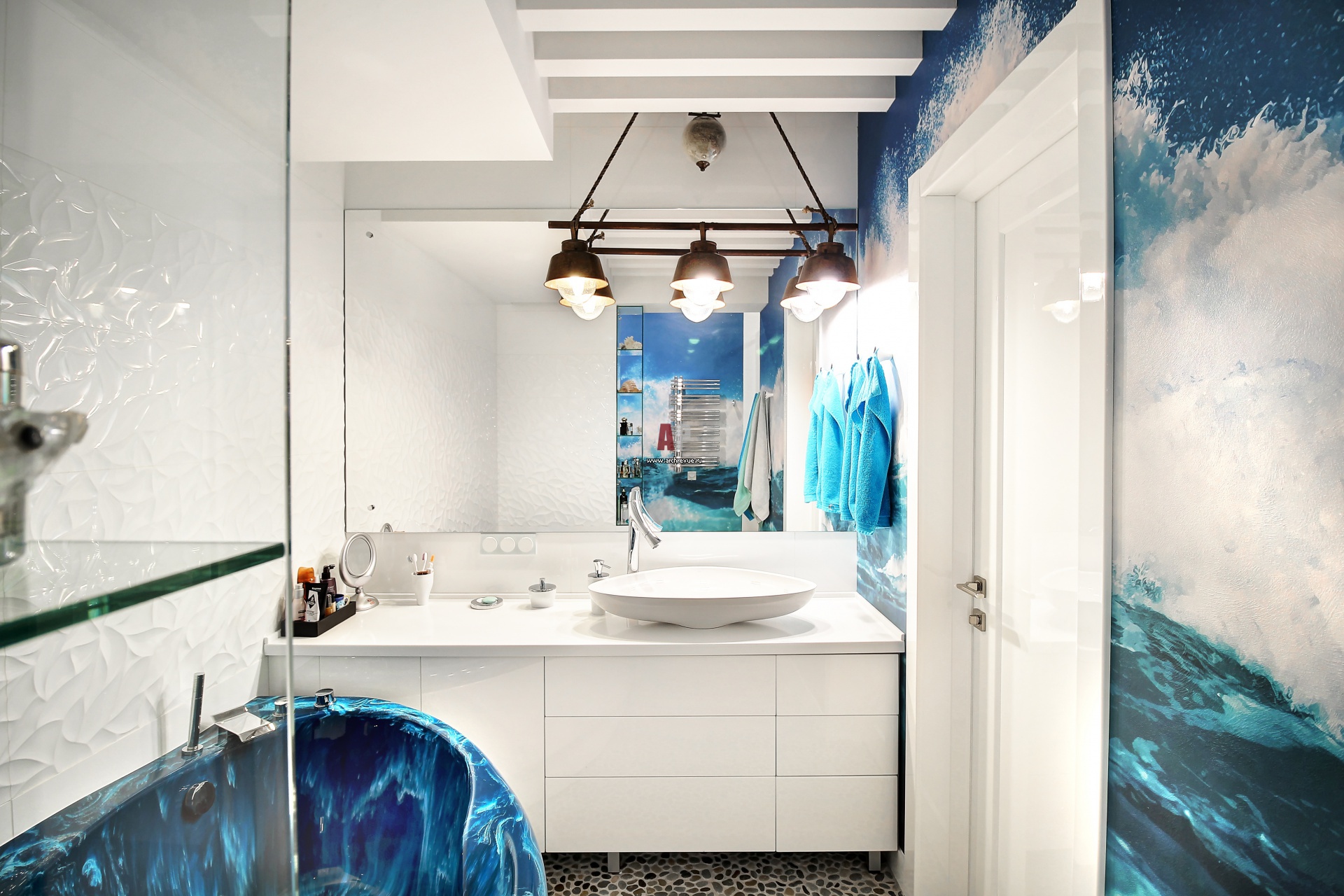 Тема океана максимально сконцентрирована в интерьере ванной комнаты. Полы выложены мозаикой из природной гальки. Фреска с изображением прибоя, плитка, имитирующая водную рябь, синяя ванна – вызывают ассоциации с водной стихией. Ванна, SPN (коллекция Santa).
