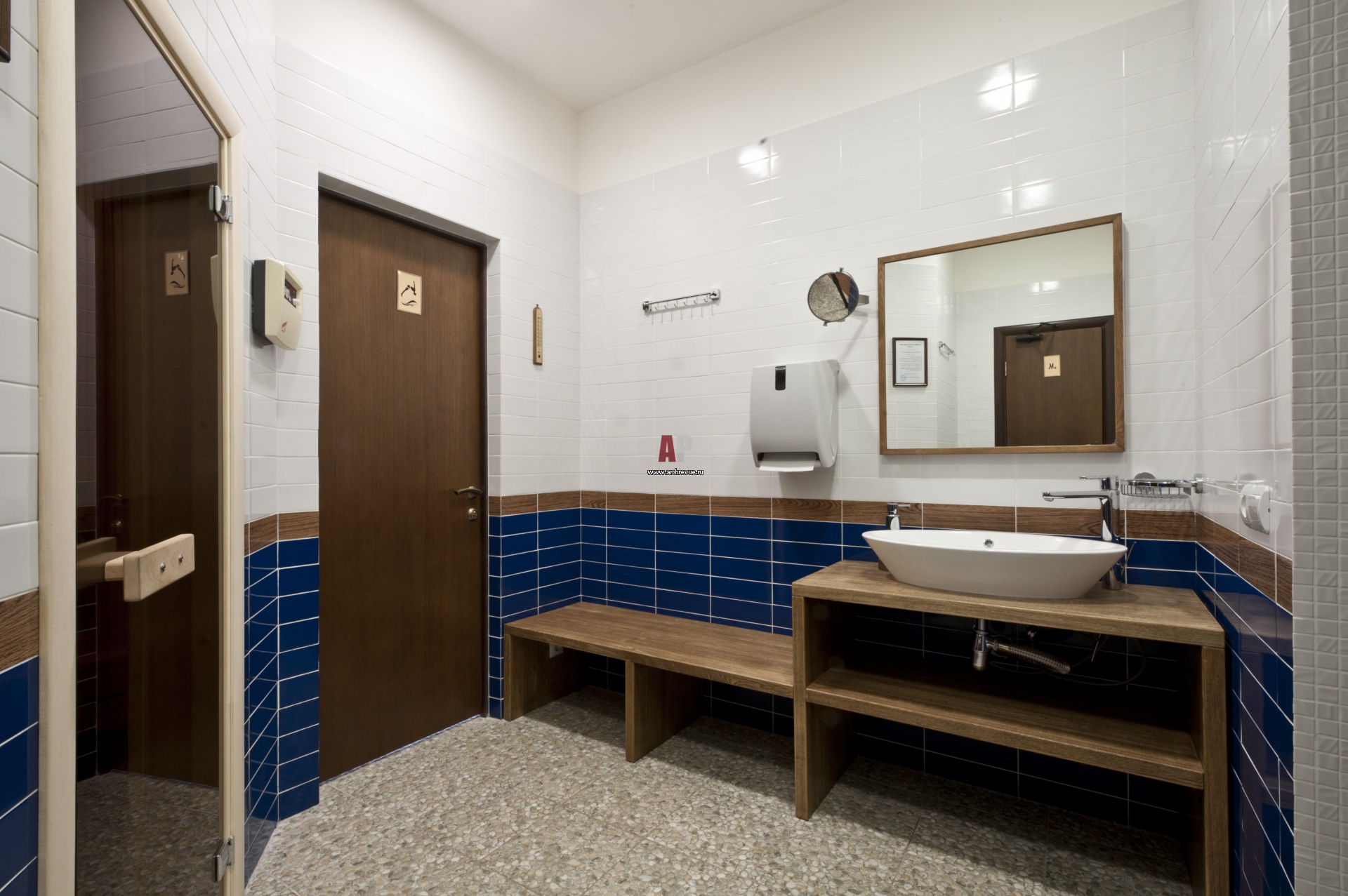 Санузел в морской бело-синей гамме с деревянной отделкой.