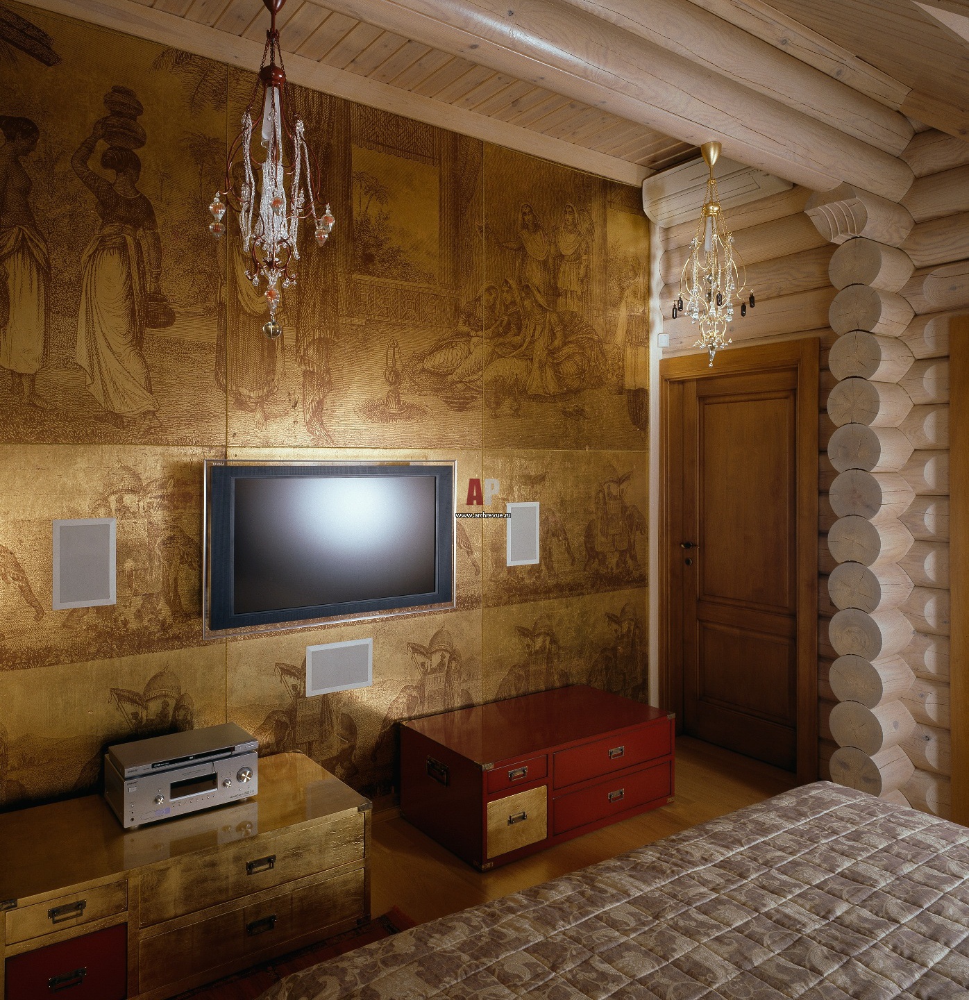 В детской спальне в золотистое панно с увеличенными во много раз гравюрами была установлена плазменная панель и колонки.