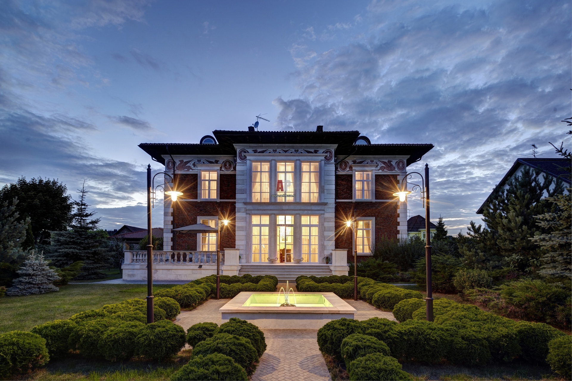 Двухэтажный особняк с классической архитектурой в духе итальянской вилл. Вид при вечернем освещении.