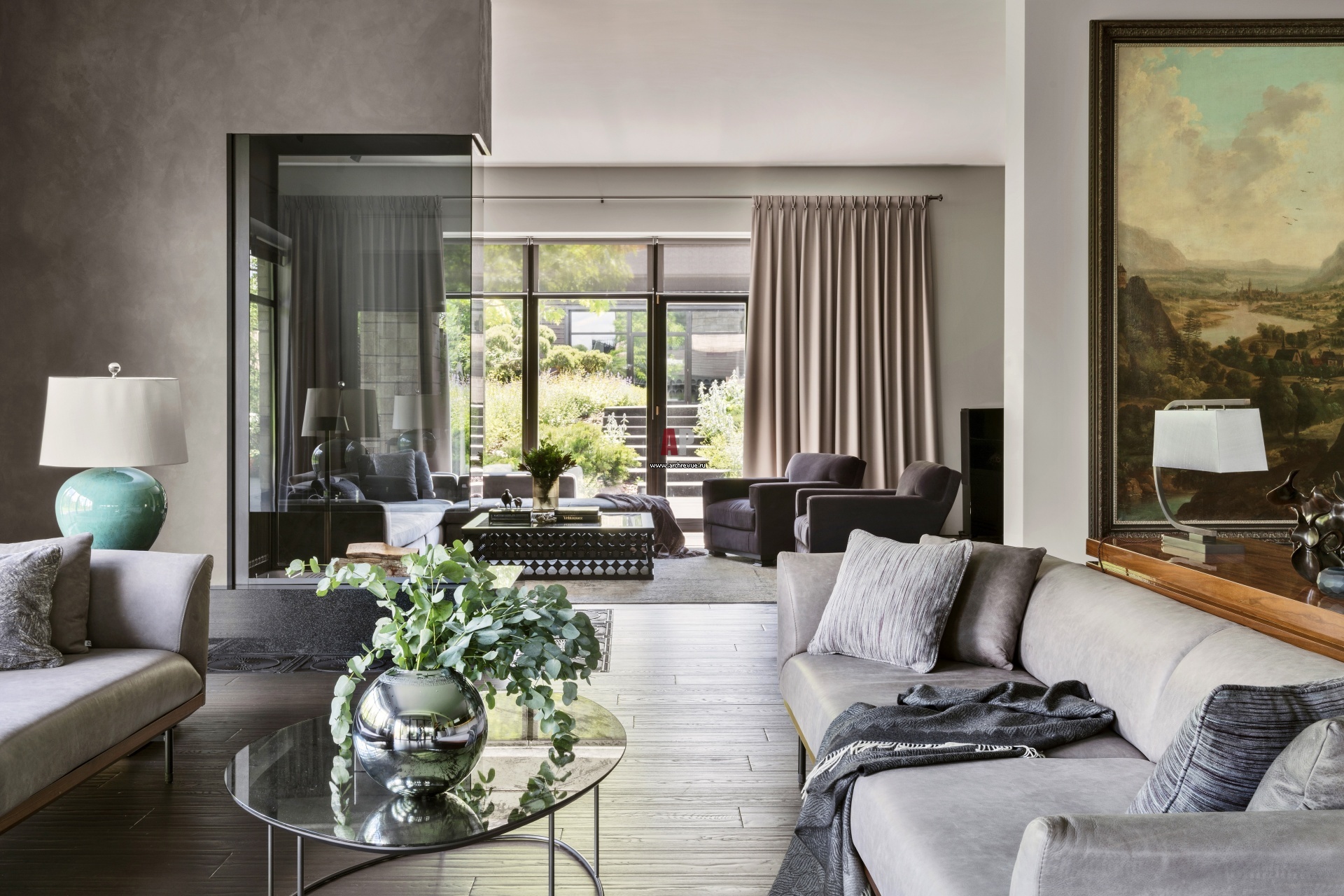Главное пространство первого этажа – элегантный салон, объединяющий гостиную, каминную, лаундж с домашним кинотеатром и парадную столовую. Диваны, The Sofa & Chair Company. Журнальный столик, Bellavista Collection. Кресла, Michael berman limited.