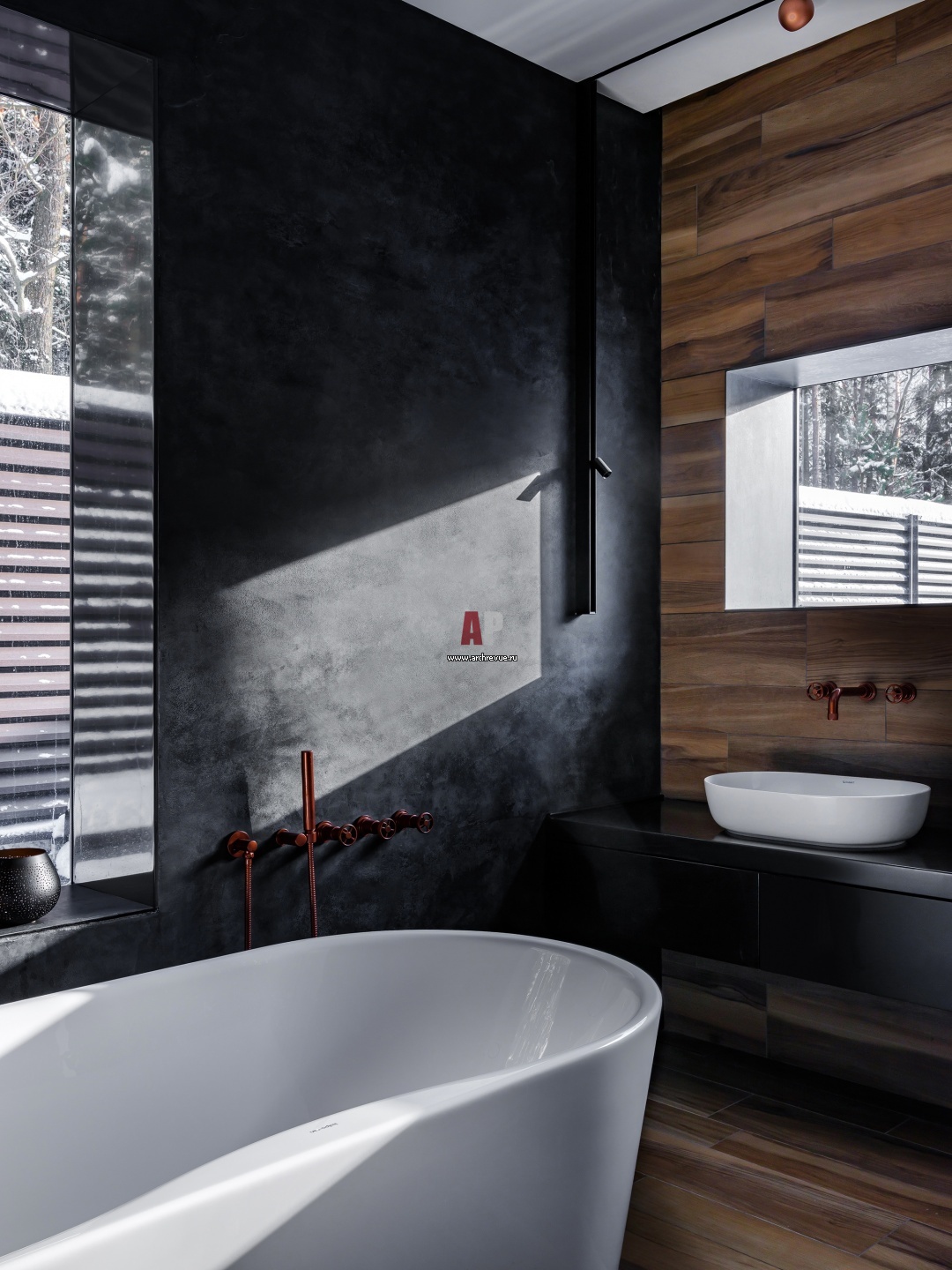 Хозяйская ванная комната. Стены отделаны черной штукатуркой и керамогранитом, имитирующим натуральный камень. Отдельностоящая ванна Kolpa-san расположена у окна с видом на лес. Рядом с ней – большая столешница из искусственного камня с двумя накладными раковинами, Duravit. Фасады нижних шкафов также выполнены из акрила. Смесители, Nicolazzi.