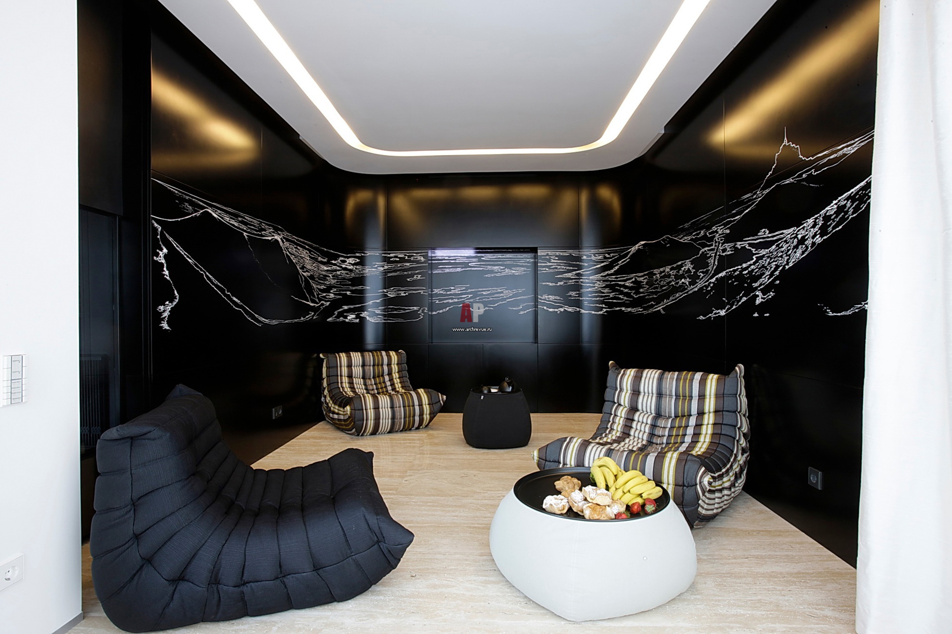 Комната отдыха или кальянная. Углы помещения были намеренно скруглены. Пространство по периметру зашито панелями из темного дерева с изображением в виде морского пейзажа. За панелями слева расположен встроенный шкаф для курительных и письменных принадлежностей.