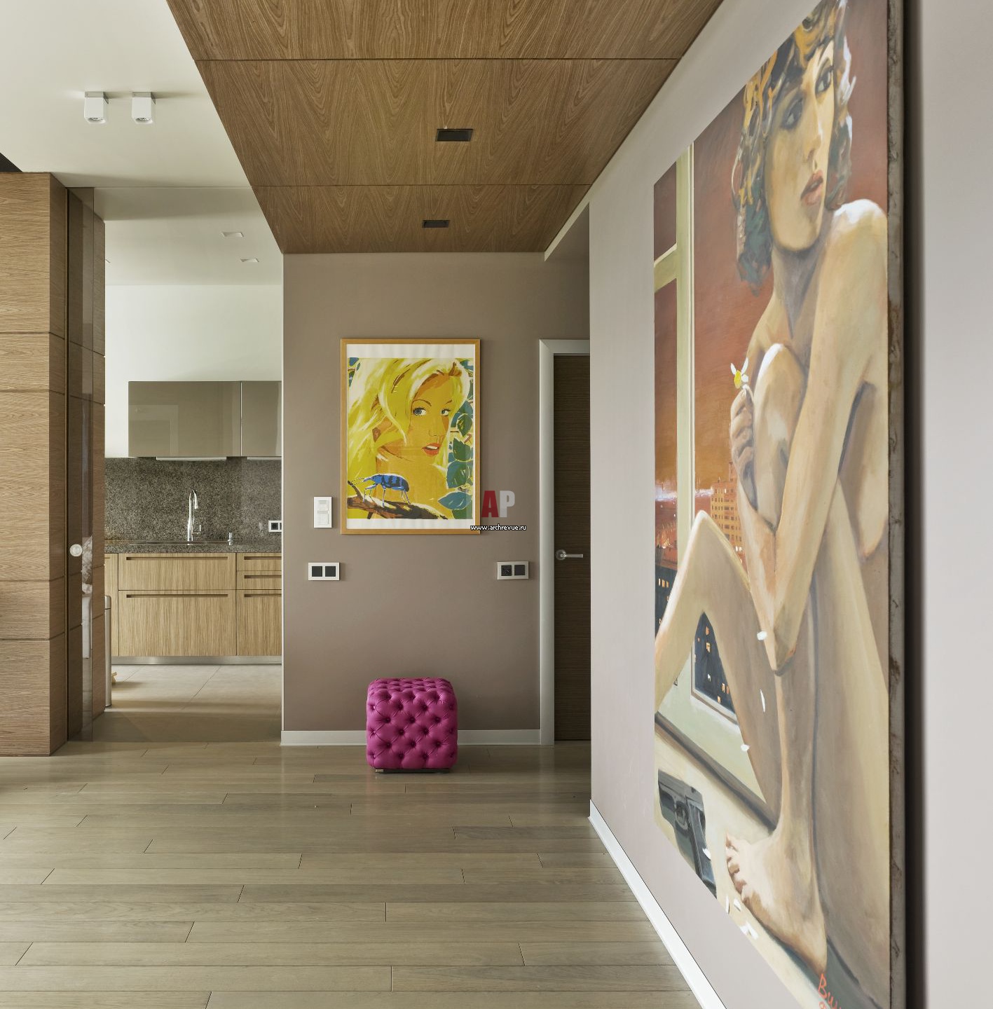 Лента из дерева на потолке, изготовление компания «ТОФ », перекликается с фасадами кухни Boffi в отделке из американского ореха.