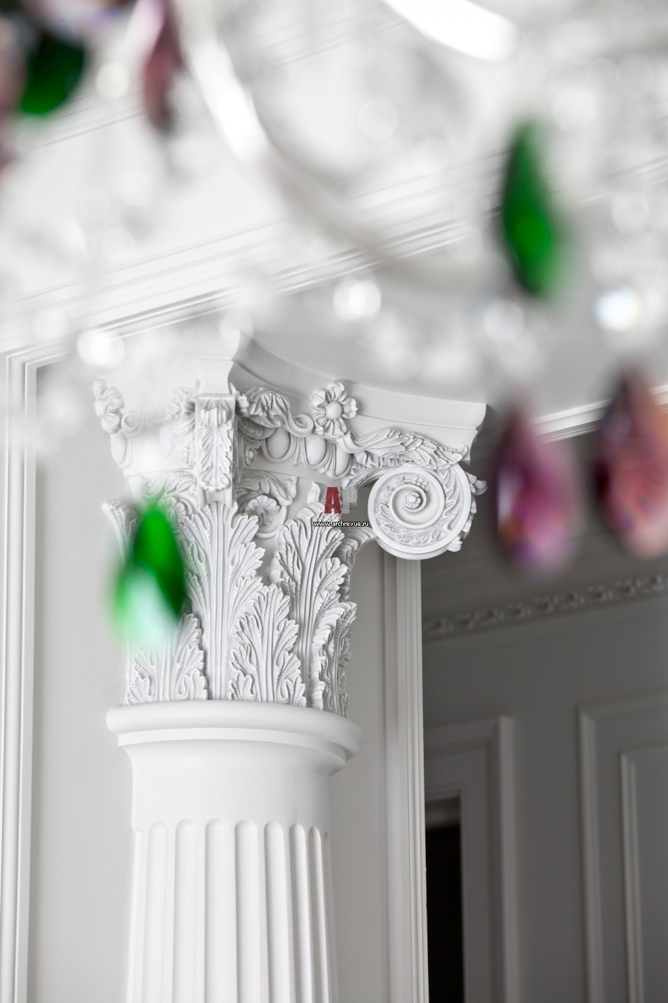 Фото интерьера гостиной квартиры в стиле неоклассика с традиционным лепным декором из гипса.