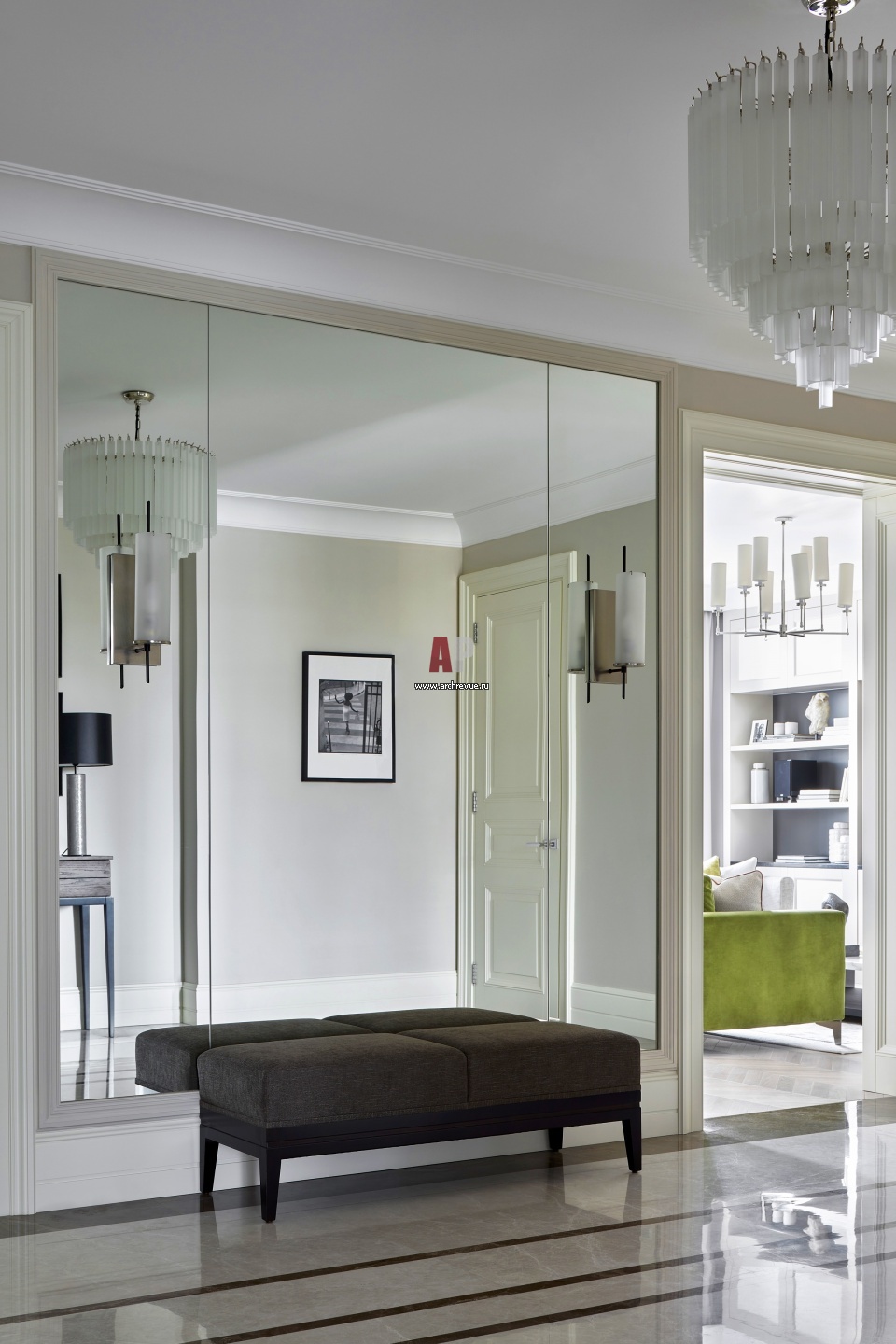 Холл первого этажа выполнен в нейтральной светлой палитре. Зеркальная стена расширяет помещение. Банкетка, Philipp Selva. Бра на зеркале, Arteriors.