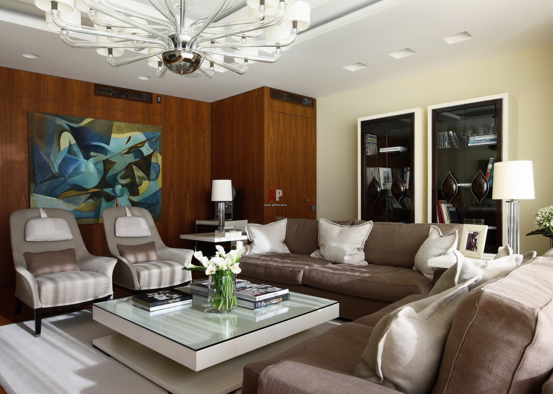 Стена напротив панорамного окна в гостиной зашита панелями из американского дуба, Lualdi Porte. В единую декоративную конструкцию встроена дверь-невидимка, она ведет в хозяйскую спальню. Диваны, кресла, Giorgetti. Витрины, журнальный столик, Tura.