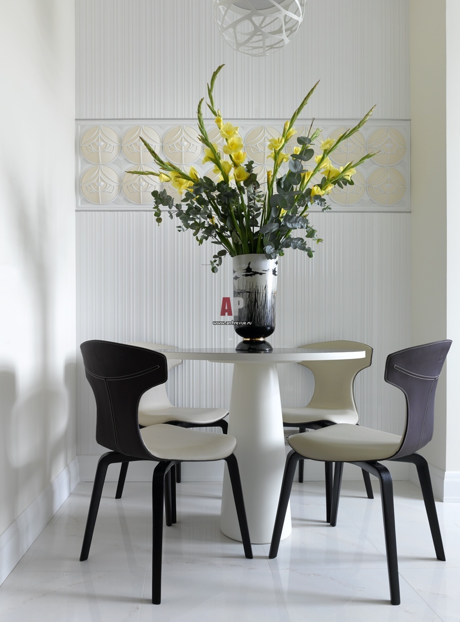 Зона для завтраков на кухне. Декор на стене вдохновлен витражами Фрэнка Ллойда Райта, барельефы выполнены из гипса, их центральная часть окрашена в золотистый цвет, как маковки церкви за окном. Стол сделан по эскизам дизайнера. Стулья, Poltrona Frau.