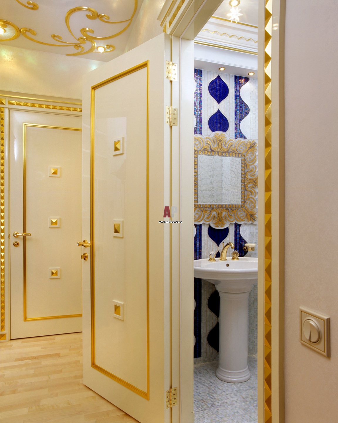 Вход в санузел. Двери сделаны на заказ и оформлены золотом в стиле ар-деко.