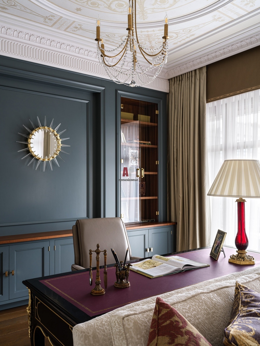 Фрагмент кабинета. Потолок украшен ручной росписью и лепным декором из гипса.