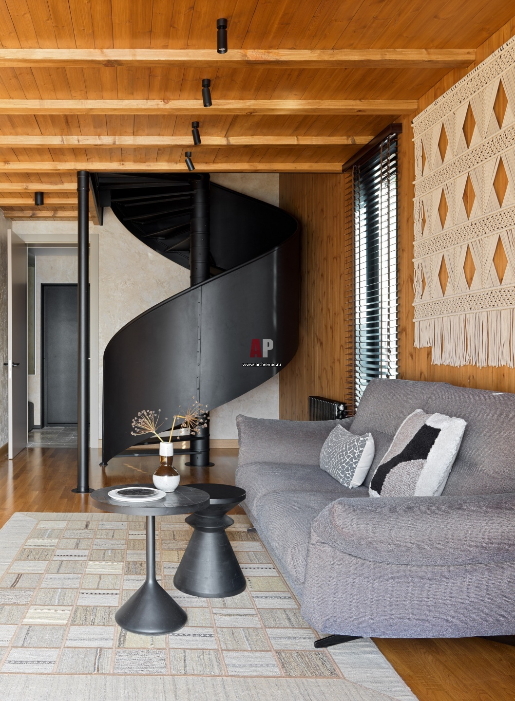 Украшение гостиной – скульптурная компактная винтовая лестница из черного металла.