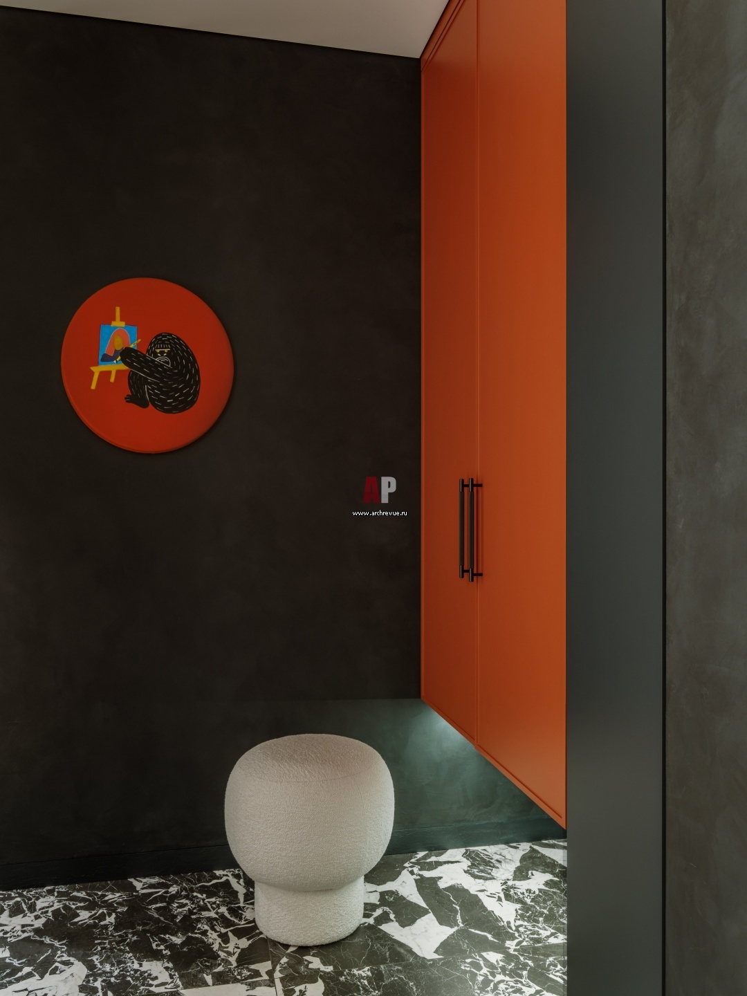 Прихожая. Пуф, Norr11. Картина Selfportrait, Екатерина Ходырева. В специальных антресолях в шкафах с отверстиями для воздуха спрятаны плит-системы, которые обычно портят внешний вид интерьера.