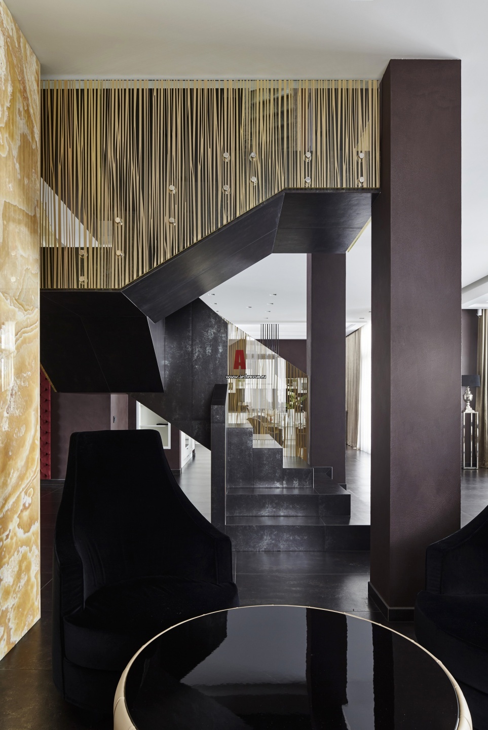 Скульптурная лестница, массивная, словно высеченная из цельного камня выглядит брутально и служит композиционным ядром, вокруг которого группируются жилые зоны.