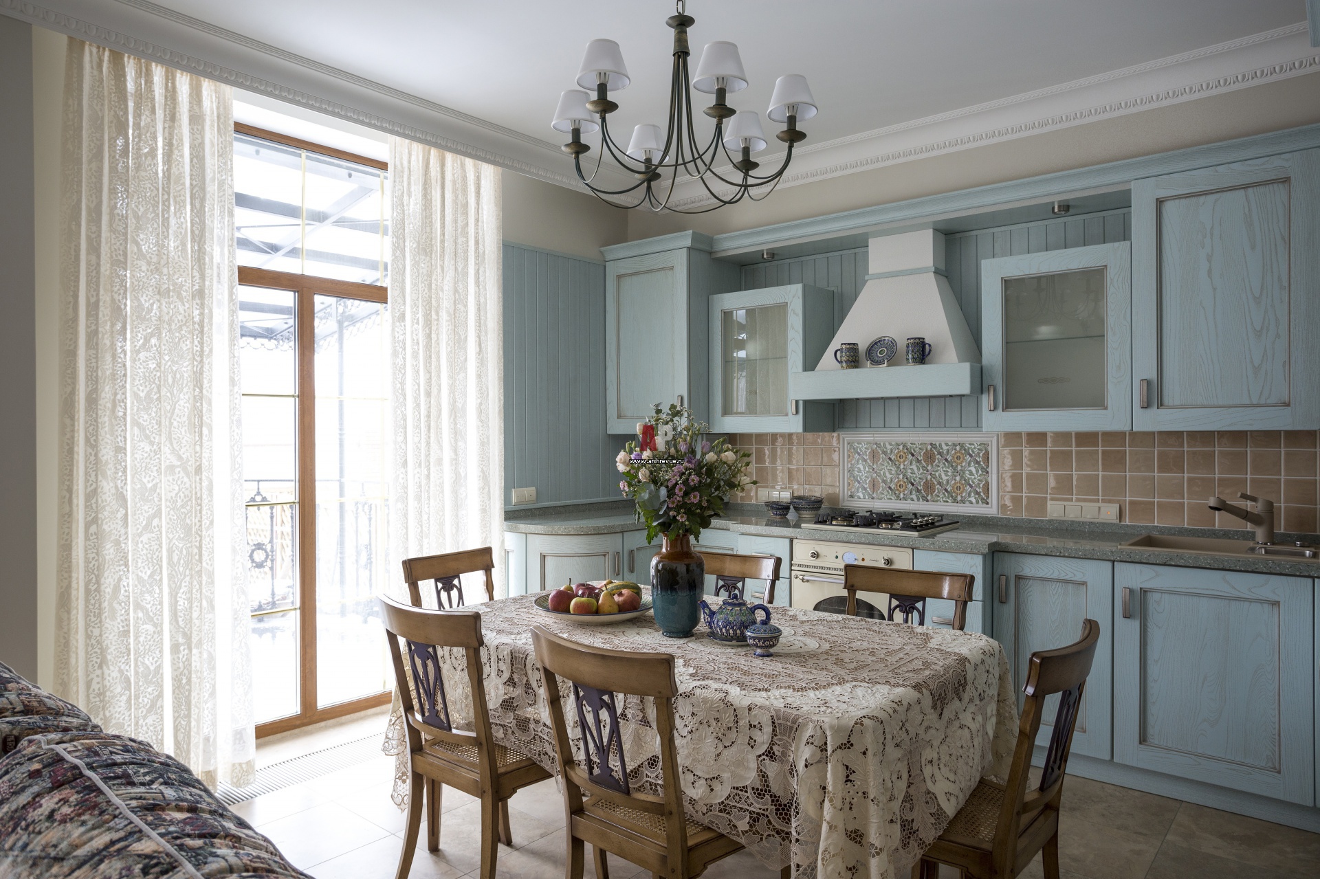 Кухонный фартук из глазурованной керамики украшен английским керамическим панно с ручной росписью. Столовая группа, Bizzotto. Обшивка кухни деревянными панелями, кружевная скатерть, винтажная газовая плита – приметы стиля кантри.