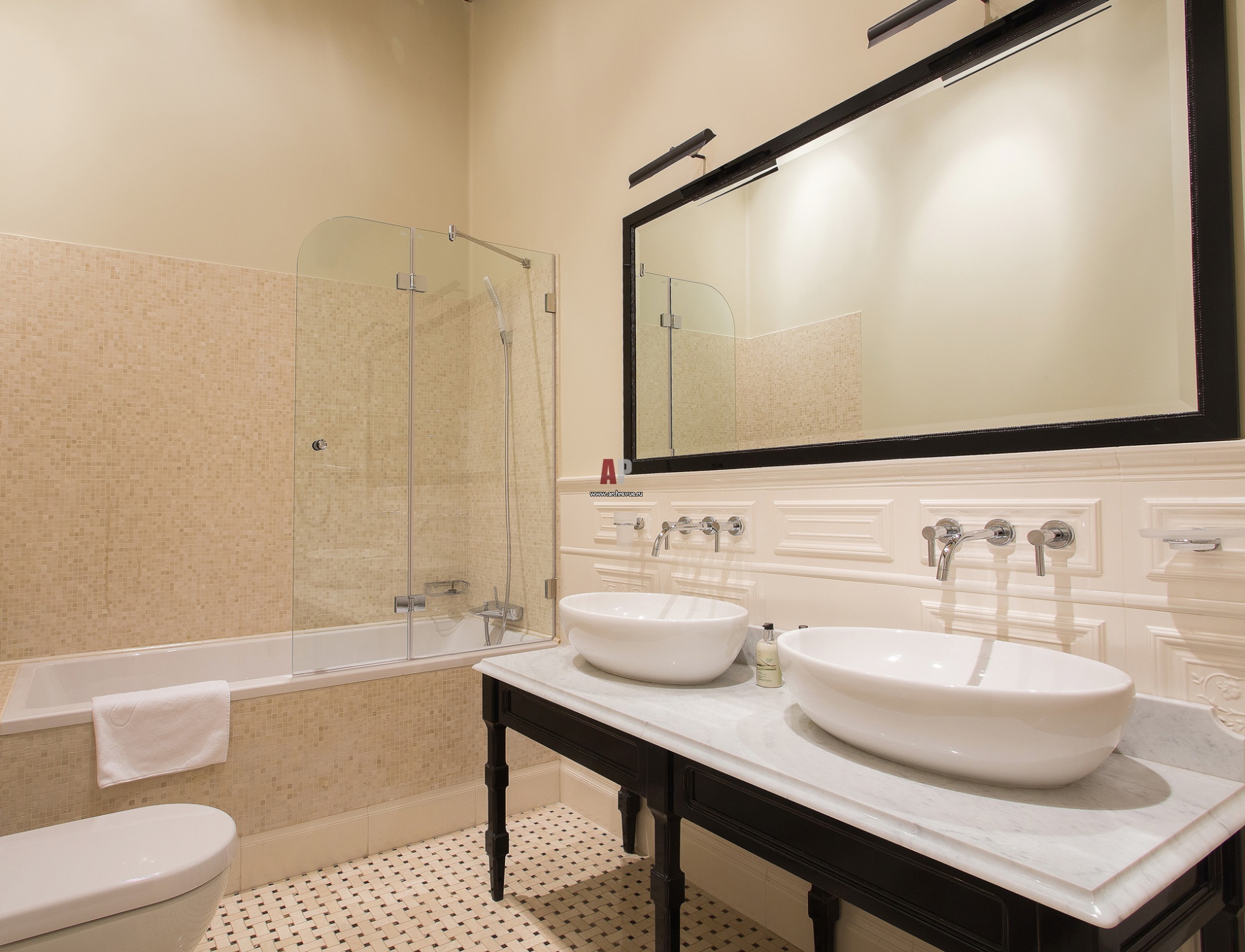 Интерьер ванной комнаты номера отеля оформлен в английском стиле. Низ стен декорирован панелями из белой керамики. Сантехника, Devon & Devon, Villeroy & Boch.