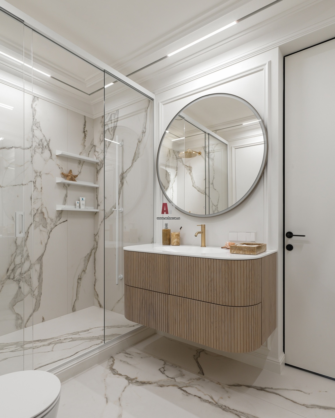 Мастер-ванная выполнена в палитре светлого мрамора. Смесители, Ritmonio. Аксессуары для ванной комнаты из натурального мрамора.