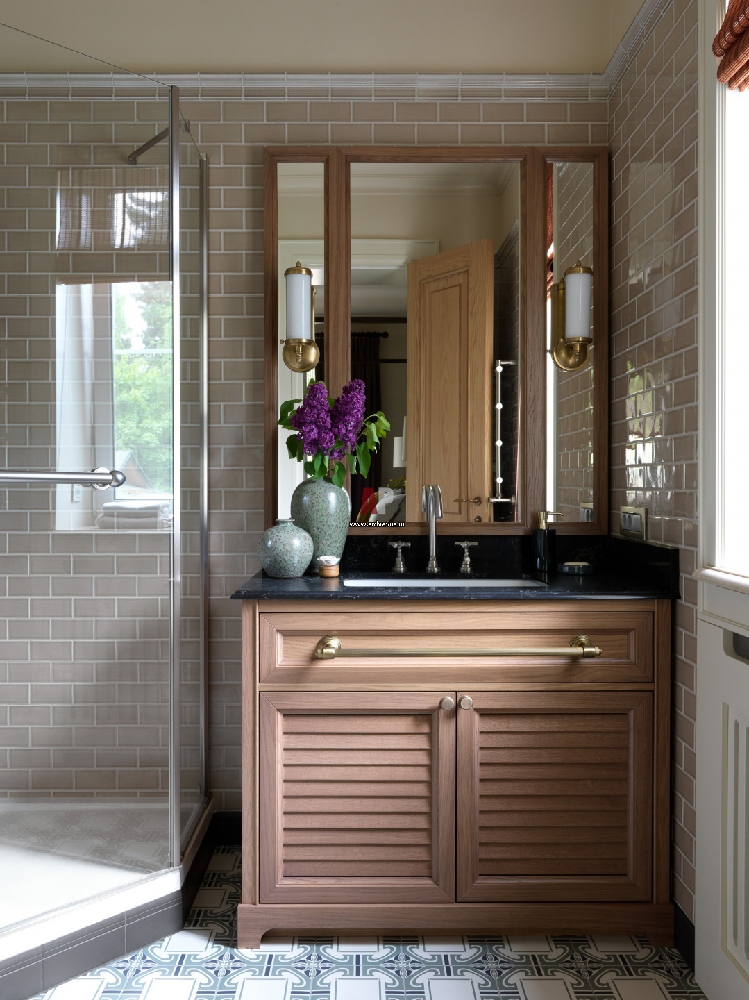 Хозяйский санузел. На полу – метлахская плитка оливкового цвета с английским орнаментом. На стенах – бежевый глянцевый «кабанчик». Раковина, Villeroy & Boch.