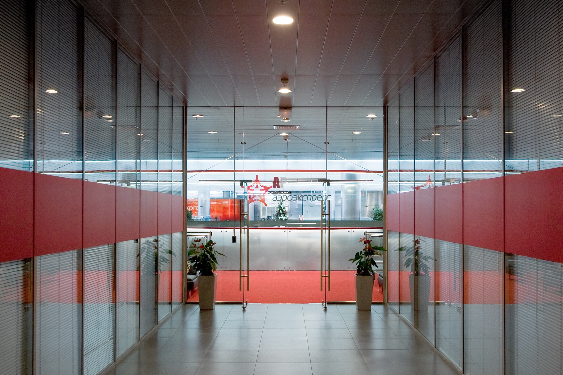 Входная зона решена в фирменных цветах компании. Перегородки выполнены из стекла-триплекс с металлической фурнитурой.