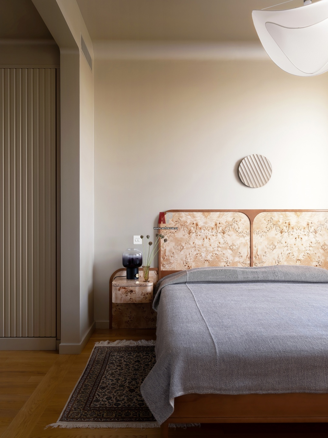Спальня. Отделка стен, краска, Caparol. Кровать со вставками из шпона тополя на заказ. Над изголовьем – керамическое панно Насти Дуленко.