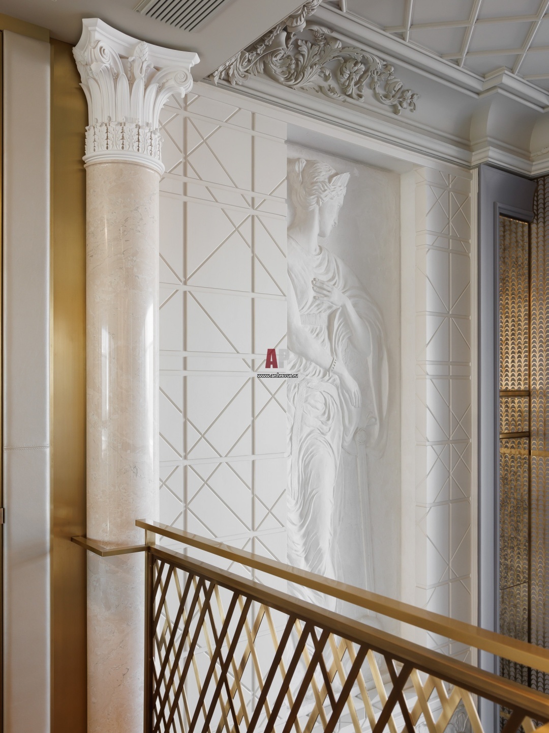 Вид из галереи второго этажа на авторский барельеф «Времена года». Ограждение выполнено из матовой латуни.
