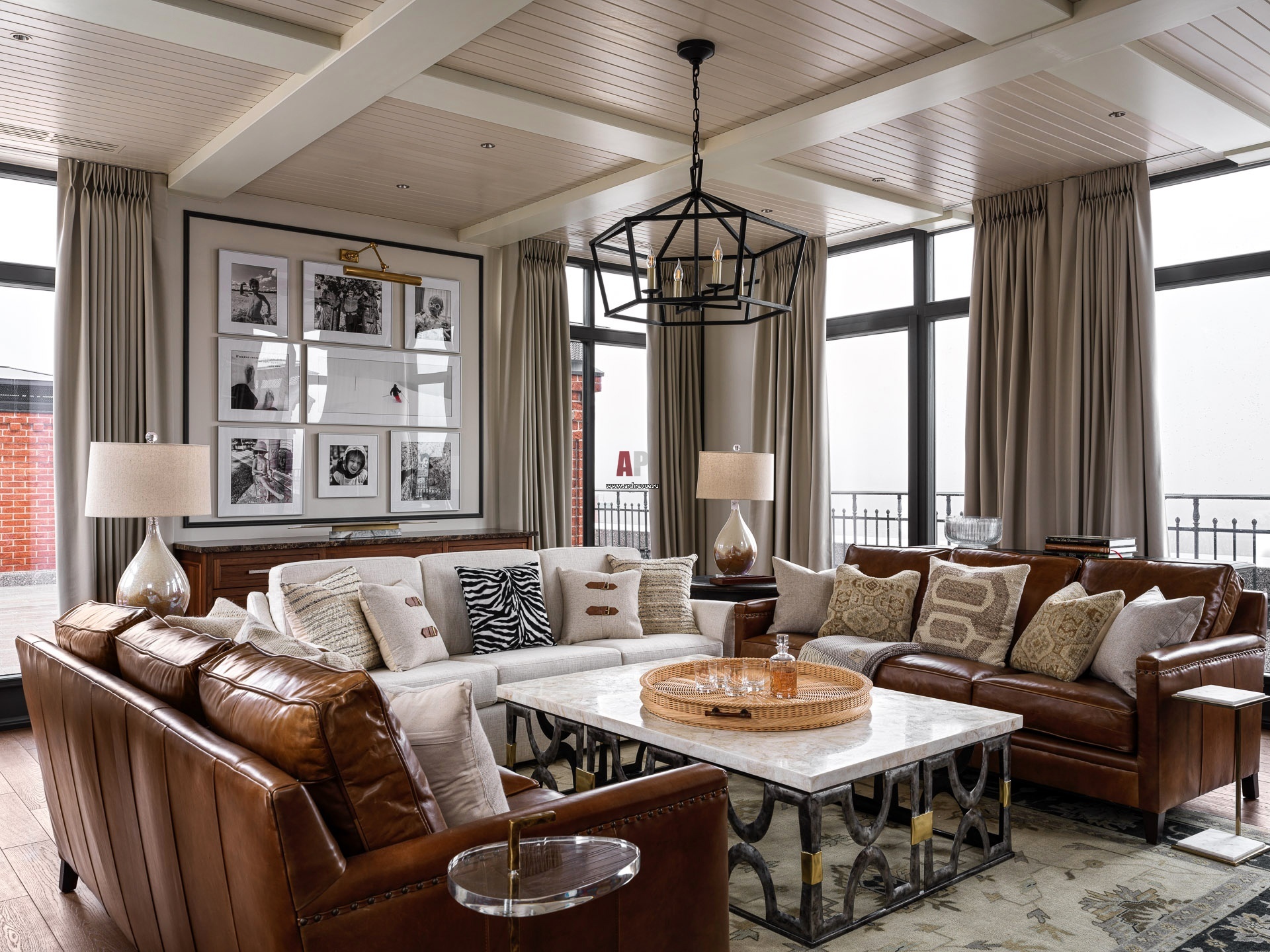 Зона отдыха второй террасы с элементами американской классики. Кофейный столик и кожаные диваны, Century Furniture.