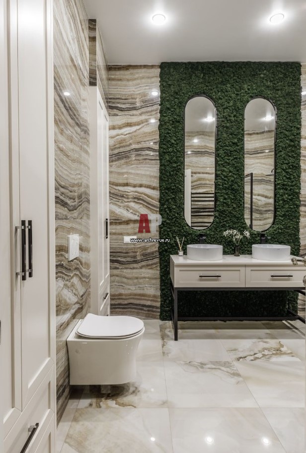 Санузел при бассейне. Стены облицованы керамогранитом с фактурой оникса. За умывальником с двумя раковинами – стена из искусственного мха.