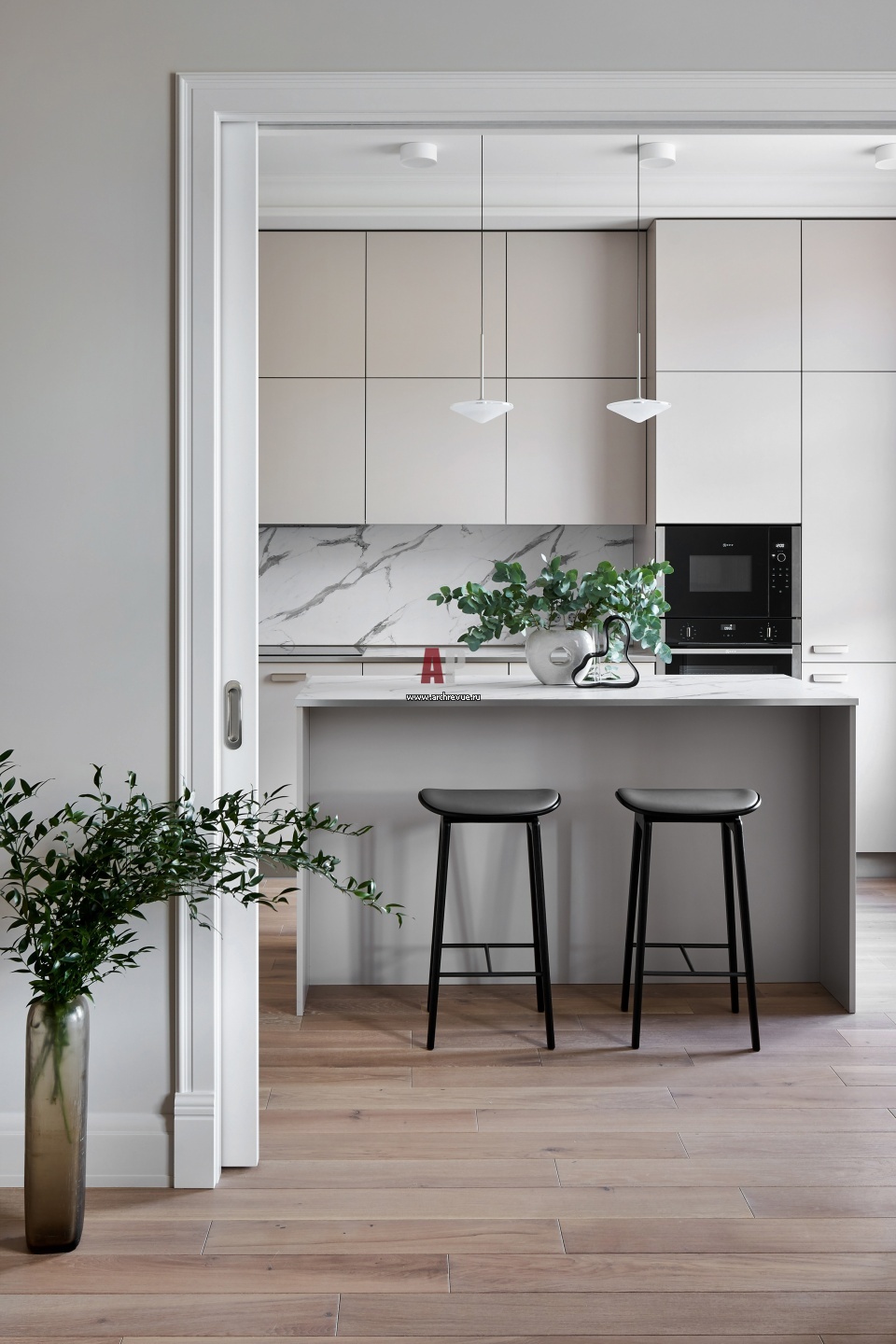 Кухня с островом сделана на заказ в общей для квартиры светло-серой палитре. Эргономика закрытых шкафов и систем хранения тщательно продумывалась, чтобы все было под рукой. Барные стулья, Norr11.