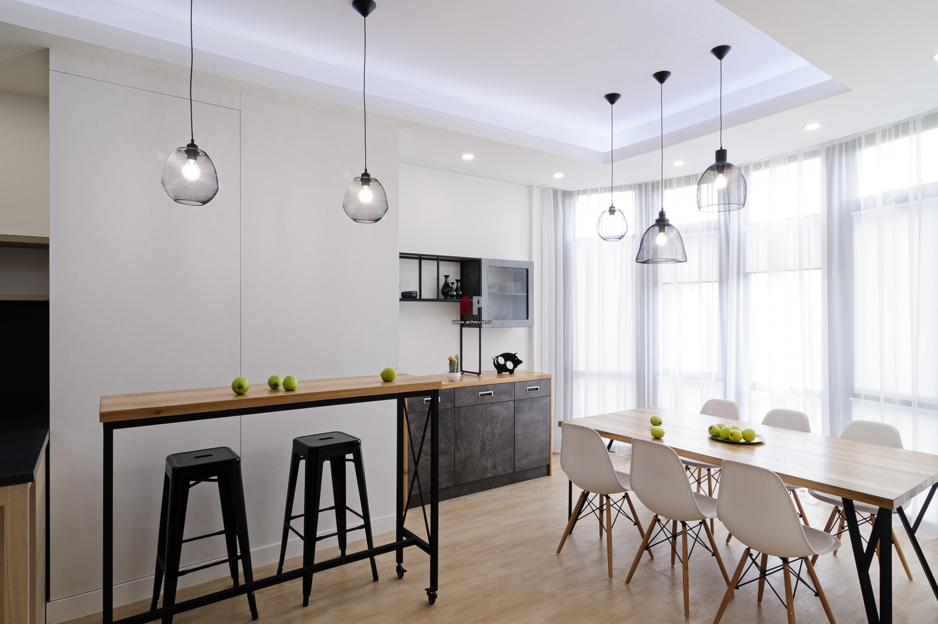 Обыгранная как белый шкаф техническая колонна делит кухню на зону приготовления пищи и столовую группу. Мебель в стиле лофт из черного металла и массива дуба сделана на заказ.
