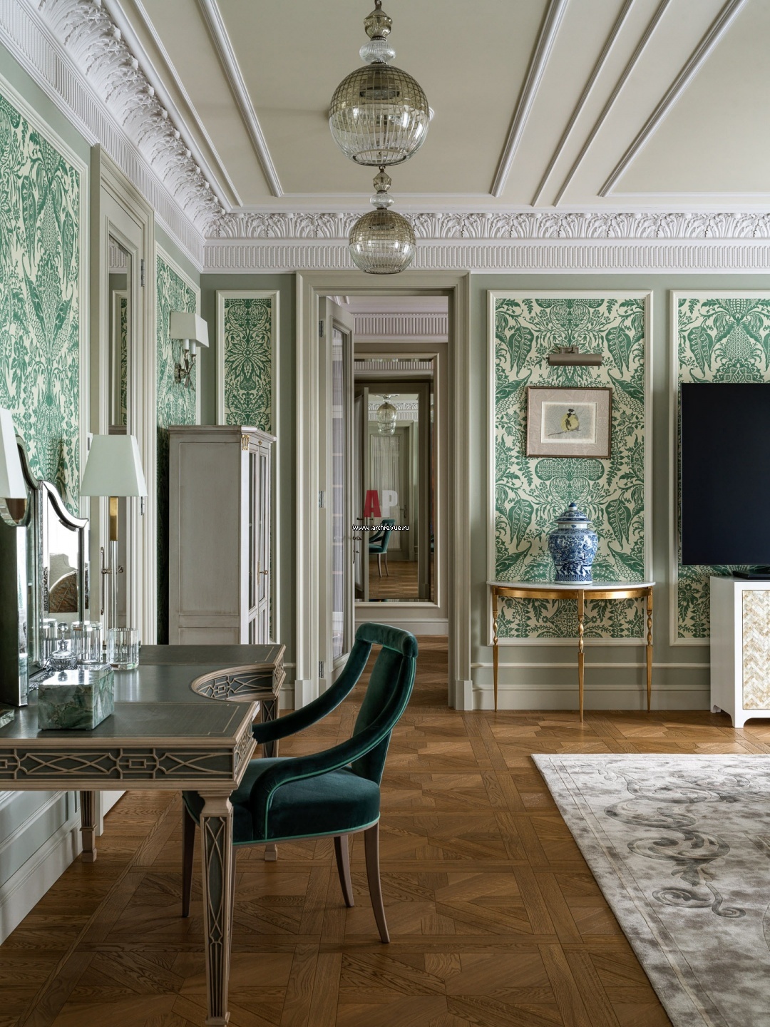 В интерьере спальни использован классический прием зеркальной симметрии. С двух сторон анфиладного помещения организованы просторные гардеробные – мужская и женская.