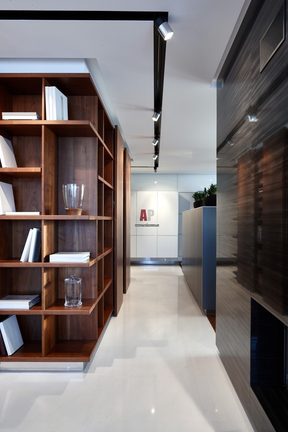 Стеллажи из американского ореха Poliform с открытыми полками и раздвижными панелями-дверями окружают по периметру центральный блок хозяйственных помещений.