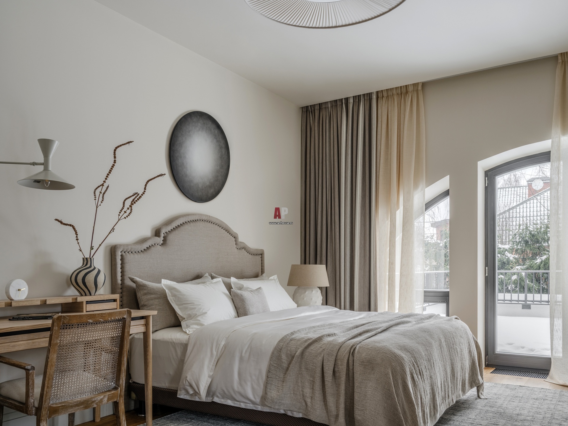Дом в средиземноморском стиле. Гостевая спальня на втором этаже выполнена в теплых светлых оттенках. Изголовье кровати, La Redoute. Стол, Dantone Home. Стул, VicalHome.