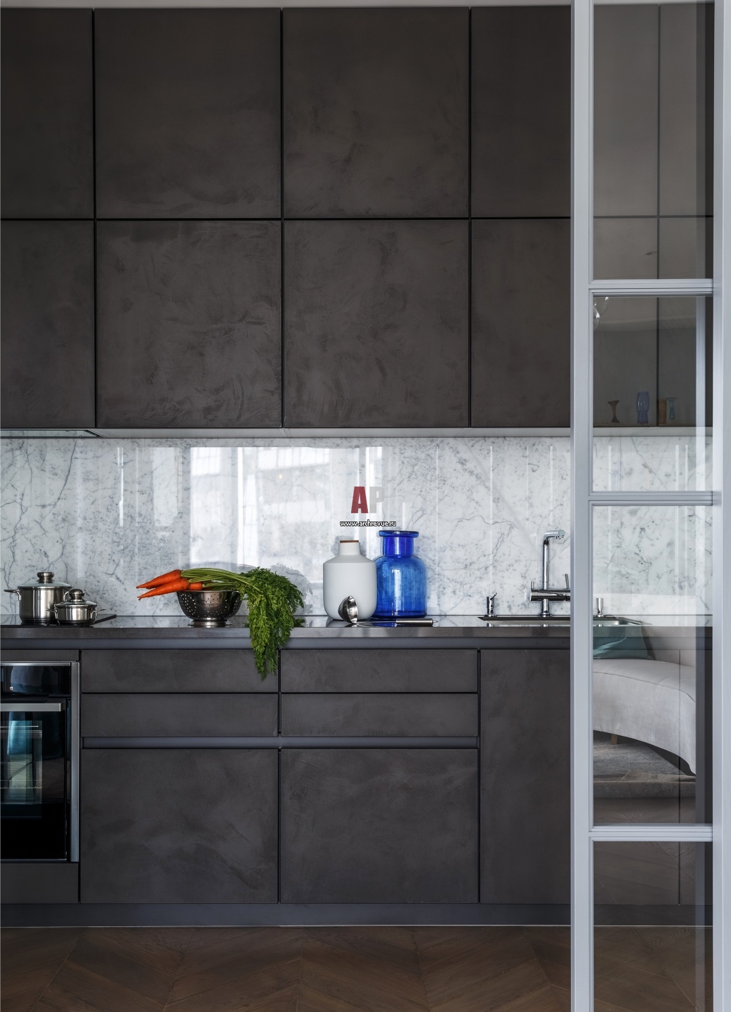 Кухонный гарнитур Leicht (модель Concrete) выполнен в стиле хай-тек. Фасады отделаны бетоном.