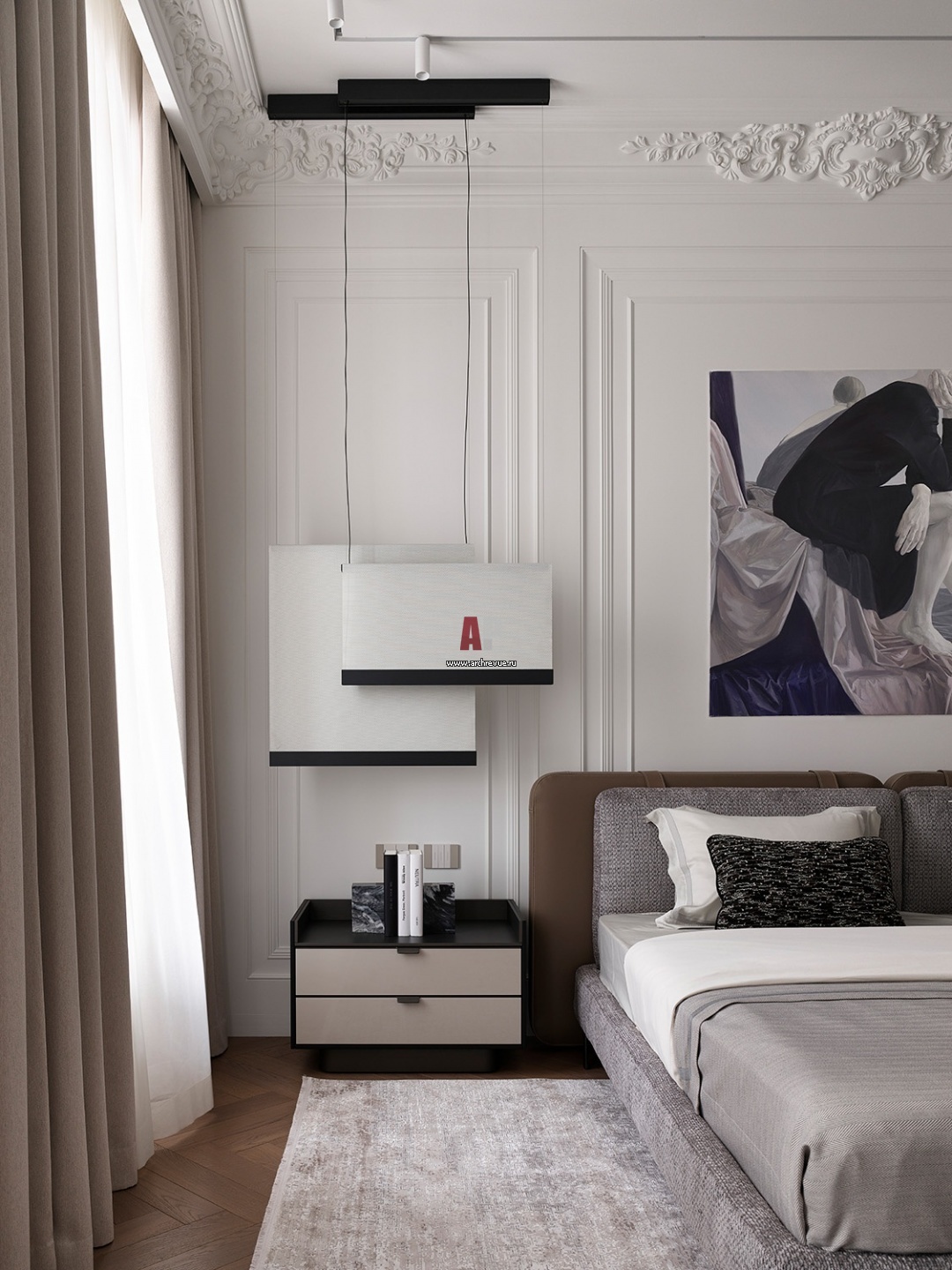 Акцент хозяйской спальни – подвесные светильники Vibia у кровати в виде широких тканных полотен. Они хорошо рассеивают свет и транслируют мягкую эстетику Азии. Кровать Miniotti с комбинированной отделкой благородной кожей и мягкого букле на подголовных подушках.